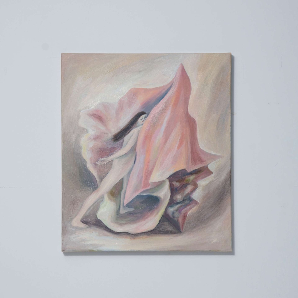 群像旁的畫《三個人》女主角凝視著手中的貝殼,並在其中發現了自身形象的投射,彷彿看見了新生的起源,而身後的鏡子,又反映了這一切的發生;《柔軟的地方》畫中女子反身走進粉紅色的海螺之中,曲折如隧道的神秘空間,又似女性陰部,意指回歸母體,同樣有向內求、反璞歸真的意趣。