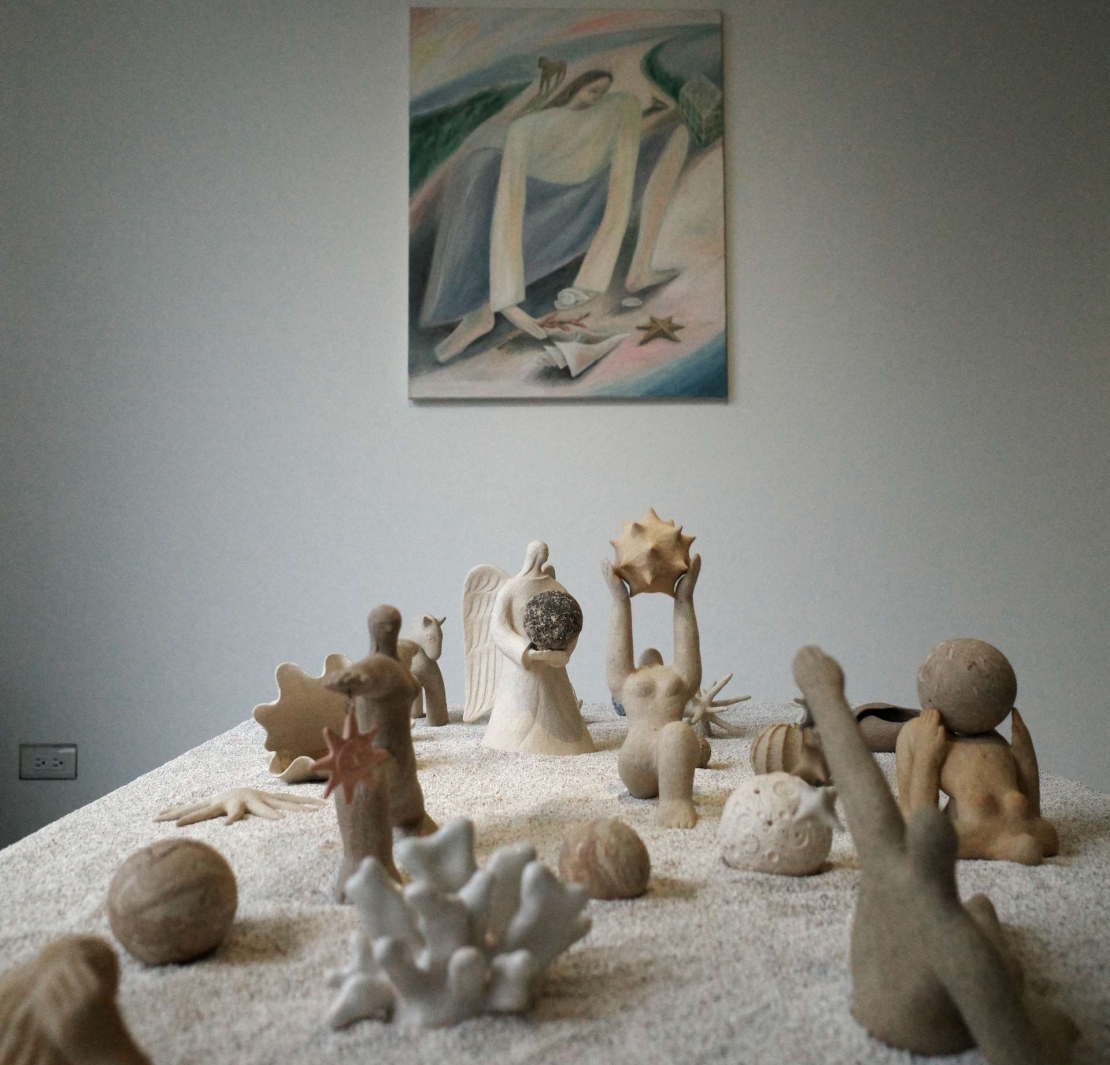 酥酥製陶工作室主理人張舒嫻,長期以來利用教課之餘的時間發展個人創作,擅長汲取童年回憶與成長經歷的她,本次個展始於畫作《撿貝殼的人》,是兒時與家人至海邊撿拾貝殼裝飾客廳茶几回憶的轉化,與畫作相對的低矮平臺上,佈滿了沙礫與陶作,海星與土星及月球錯落並置,標誌性的《守護天使》與《校準星星的人》一旁同時有《拜日》者與《平衡的練習》,將舞蹈經驗理的肢體表情與律動帶入陶作,同時點題。