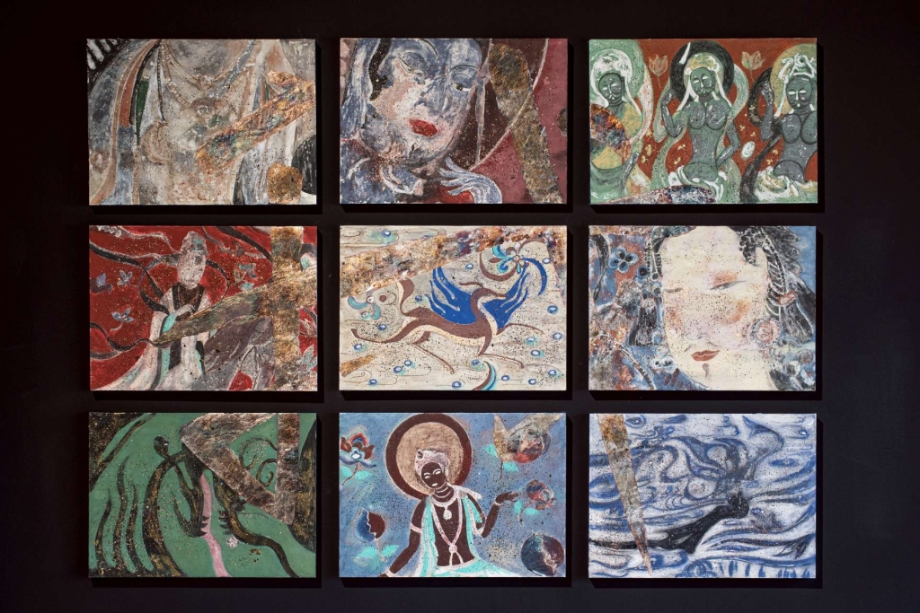 本次個展除了大理石作品之外,很難得還有為數不少的繪畫作品,其中又以油彩與壓克力顏料複合者為大宗,即使如此,其用色仍然帶有濃厚的東方韻味,尤其是《故鄉冥想》、《故都長河》等作品,很容易聯想到張大千潑墨恣意揮灑時的石青石綠,巧妙的是張大千自認施色復古,此等用色可以追溯至唐朝盛行的青綠山水,恰恰與李紫晴獨鍾的敦煌風華鼎盛的時期重疊,再次驗證了敦煌最出名的佛教藝術,對李紫晴繪畫的啟發不僅止於神佛法器形象,也擴及色彩的運用,以及時間留下的紋路肌理,以《故鄉冥想》為例,辨認度極高的髮髻、顯著的耳垂、背後的圓光,都使得只以輪廓帶出的釋迦牟尼佛形象不言而喻,像湖面的漣漪、雨中的水痕,卻天外飛來一筆在畫面加上了如刮擦斑駁的痕跡,頗有石窟摩崖之意趣,令人會心。特別值得注意的還有本次首度亮相,具有實驗性的畫作《歸鄉》,由九張小圖組成的岩彩畫,除了礦物顏料外,還將岩石雕刻剩下的物料磨成粉後入畫,並且以「我」字橫跨九宮格構圖,自型顏色接近於背景原色,而使得乍看之下彷彿畫面字跡處煙消雲散的錯覺,演繹佛家「無我」的意趣。