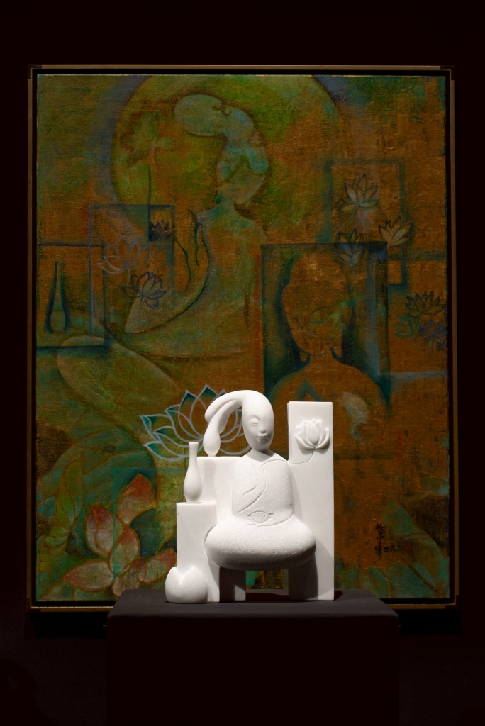 雖然不是從石材加工本科出身,深受敦煌石窟、唐卡繪畫等瑰麗莊嚴的佛教藝術吸引的她,因緣際會之下在1999年參與了埔里中台禪寺主殿佛像製作工程,紮實的石雕技術能力備受肯定。「流與留——穿越婆娑之巔」個展訪談之中,李紫晴謙稱自己對於佛教教義涉獵不深,主要是讚嘆於中國等地之「摩崖造像」超乎寫實比例結構的獨特審美展現與迷人風韻。她更進一步強調,佛教有其儀軌、經文不是她關注的領域,而是特別對於造像與法器、繪畫深感興趣。除了傳統造像外,本次展覽特別著重造型獨特,比典型佛教造像更具有個人特色的作品,策展挑選了以觀音淨水瓶為靈感,顛覆古典形制的多組石像,淨水瓶據信裝有「甘露」,有治癒疾病、消除苦厄之效,代表著觀音菩薩普度眾生的願力,在李紫晴的詮釋下,觀音的頭部液態化,不見預期中的髮髻與冠飾,取而代之的是半張精簡的臉龐,彷彿被揉捏拉拔,向上延伸成如湧泉水柱再轉為如水珠流淌的秀髮。以《持蓮觀音》為例,可以發現除了露水與瓶身的變換運用外,簡約俐落的幾何方柱,同時構建了場景之景深,讓盤腿而坐的觀音得以懸空自若。