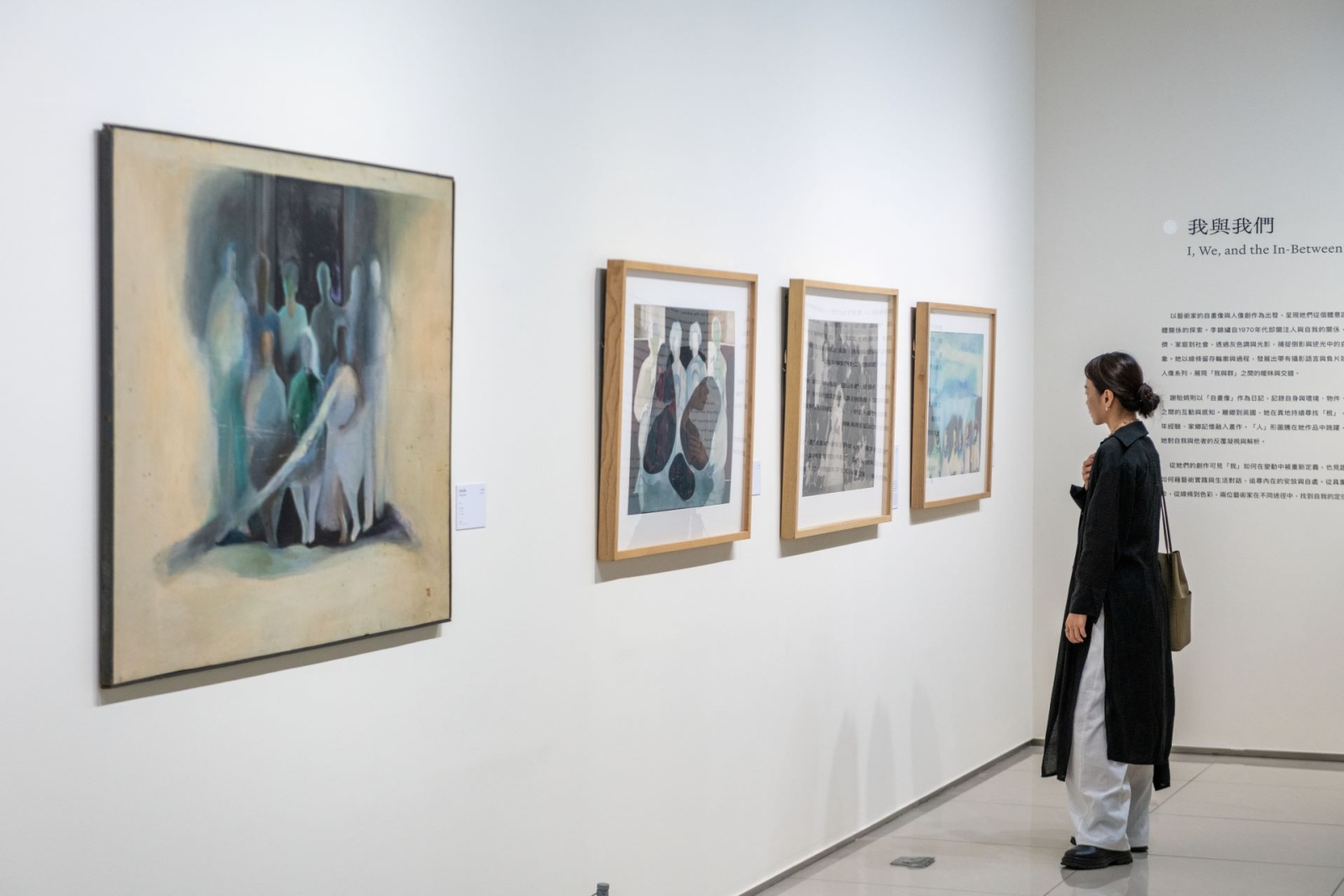 「我與我們」展區以兩位藝術家的自畫像作為破題,呈現藝術家如何處理自我與人群的關係。迥異於當時臺灣藝壇風行的照相寫實主義,李錦繡在人物的描繪援用負片的概念,所呈現的朦朧形象與陰鬱色調已然奠定日後創作的基調。她在1970年代中期展開長達七年的家族照片系列,如1978年的《婚禮》以常見的親友群像為構圖,卻難以識別面容加之灰階色彩,而讓喜慶氛圍反轉為幽微隱晦,流露出獨到的創作語言與前衛性。