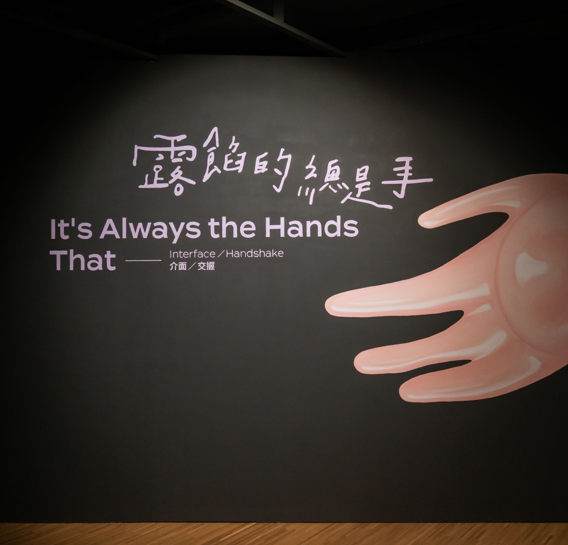 李佳霖長期關注數位時代的身體感,而這次展覽「露餡的總是手—介面/交握」,選擇以「手」為技術介面出發,顯得特別貼切。尤其我們身處的這個世代,滑手機、觸碰螢幕,更是早已日常到氾濫的行為了。一走進展間,立即就能看見主視覺牆面,沒有過多的文字資訊,只有展覽名稱與那顯目的手。好似又一次提醒我們,在數位時代裡文字資訊容易被忽略,但影像卻成為重要的溝通媒介。