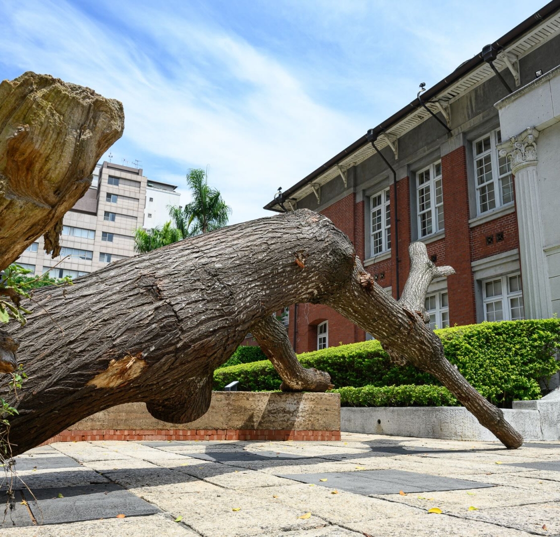 展場入口,瑞士藝術家李奧納多・布爾吉・特諾里奧的《一層層疊起》橫斜躺置於地上的樹木軀幹,是源自2024年康芮颱風後被吹倒的苦楝樹,環伺周圍如同人行道座椅的土磚,則是取材自墓地挖掘時多餘的土壤,樹體及泥磚共同展示出原先藏於內部的裸露肌理。自然與人為並置,將風災植物與墓園土壤轉化為開放的紀念碑空間,既是對自然與死亡的見證,也是對人類活動與環境交織所導致災變的隱喻。