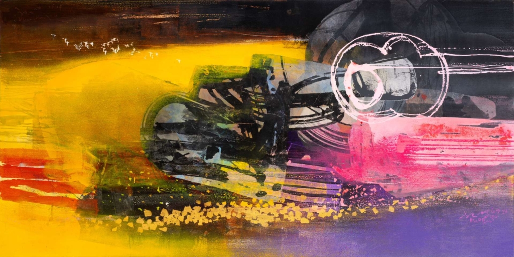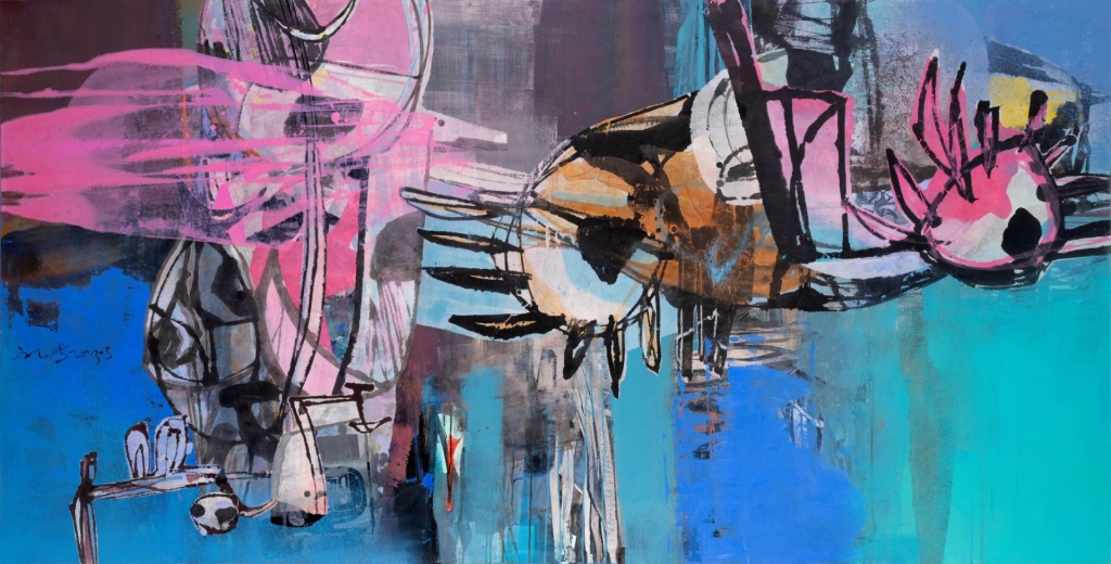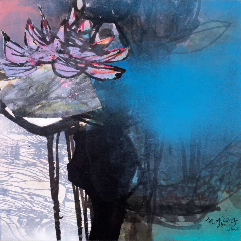 此外,「金韻荷風」系列作品在暗合強調華麗輝煌裝飾性的「琳派」繪畫傳統之外,其以饒富節奏、提按有致的筆墨線條繁複交織而成的畫面,則體現了有生必有凋的自然定律美感。與前述對應的「狂草」系列作品每每有濃墨筆觸恣情拖曳在繽紛色彩潑灑滴流的畫面上,巧妙地融合了西方抽象藝術與東方筆墨精神,一定程度上亦可視為其對趙春翔乃師的紀念與致意。