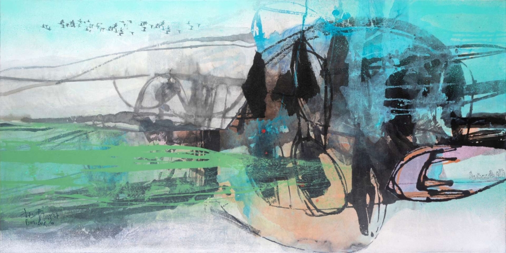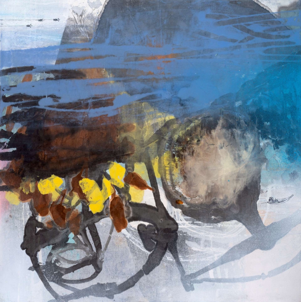 此次深刻的觀展經驗讓郭博州得以再一次透過創作反思人跟自然的關係。尤其在半百之後,他不但慢慢把色彩給找回來,也翻轉了從草稿到定稿完全在自己掌握之中的創作方法,而是如修行般地讓自己回歸到「胸無成竹」的空明境地,賦予創作更多空間及想像可能。因此,像是在展出的多件「早春行旅」系列作品中,觀者可以輕易看到在大片結合描繪、塗抹以及遮蓋等多種媒材技法構成的抽象畫面中,他刻意挪用漢代畫像磚的舞俑、《嬰戲圖》中歡樂玩耍的孩童,乃至於古代繪畫中常見的泛舟、垂釣、觀雲、賞月等點景人物形象,頗得穿梭時空、今古同遊之樂,既是藝術家一己性情寄託的象徵,也道出了知音存在的重要性。