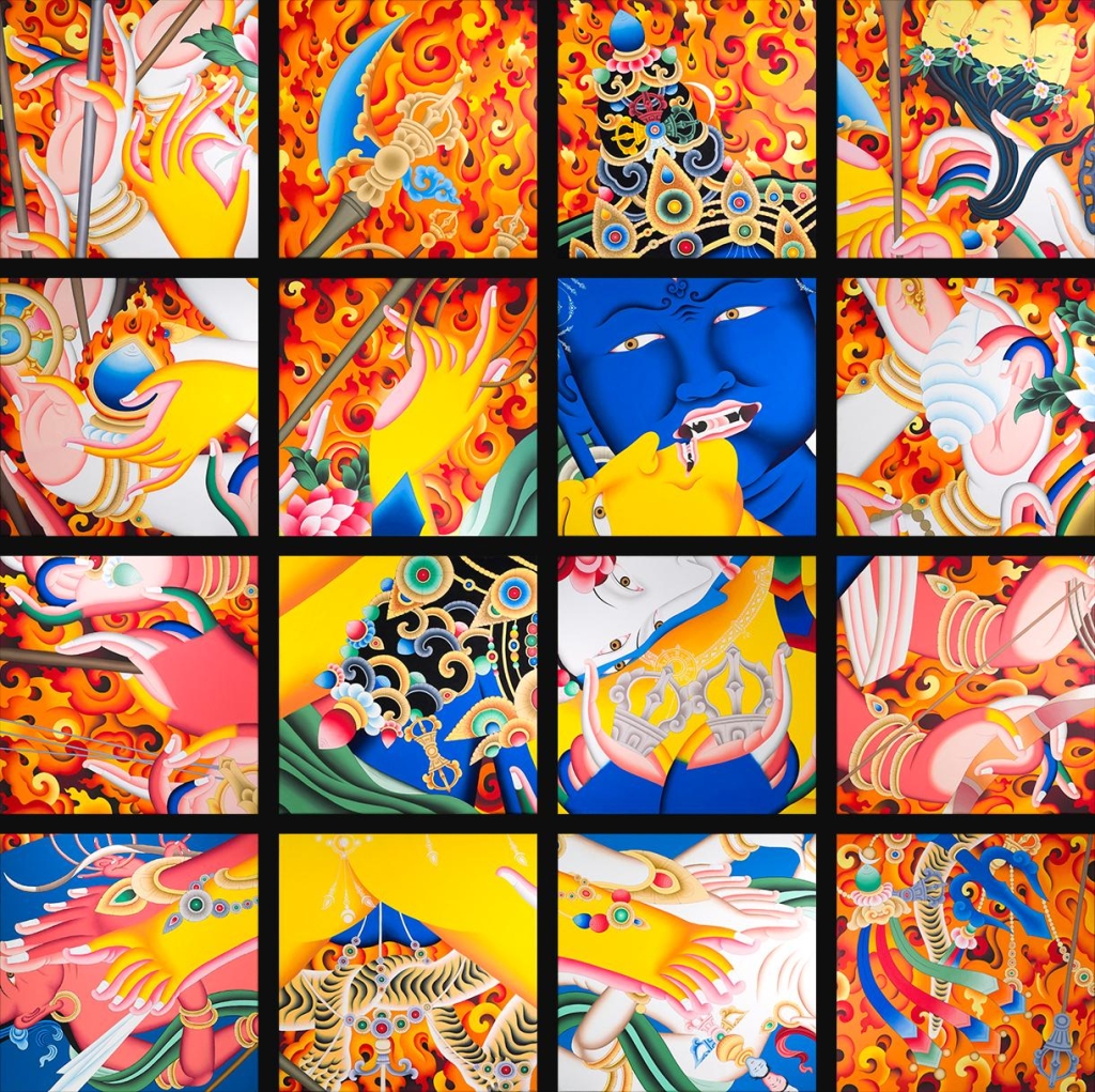 正是基於這樣的自問,夏爾帕大量實驗不同的造形手法,將自己過往創作的圖像變形、旋轉、分割,他發覺比起直接繪製佛像,距離佛法的思考反而更近了一步:「當造型發生變化,我們是否仍以同樣的眼光看待這些圖像?當客體發生了變化,主體會發生什麼?」「色即是空、空即是色」,創作中的藝術家對此獲得了新的體悟。其中,這次展出的一組「碎片」系列主題為「吉祥天母」(Palden Lhamo)和「時輪」(Kalachakra),以傳統唐卡主題為核心圖像,從中攫取不同的片斷、分別繪製於小幅畫布上,時而放大局部細節,時而拉遠呈現較完整的形象,儘管同源,卻無意拼組為完整圖像,它們各自皆可被視作獨立畫面,與整體之間的關係之中可引申許多哲學性的思考,交由觀者去進行。