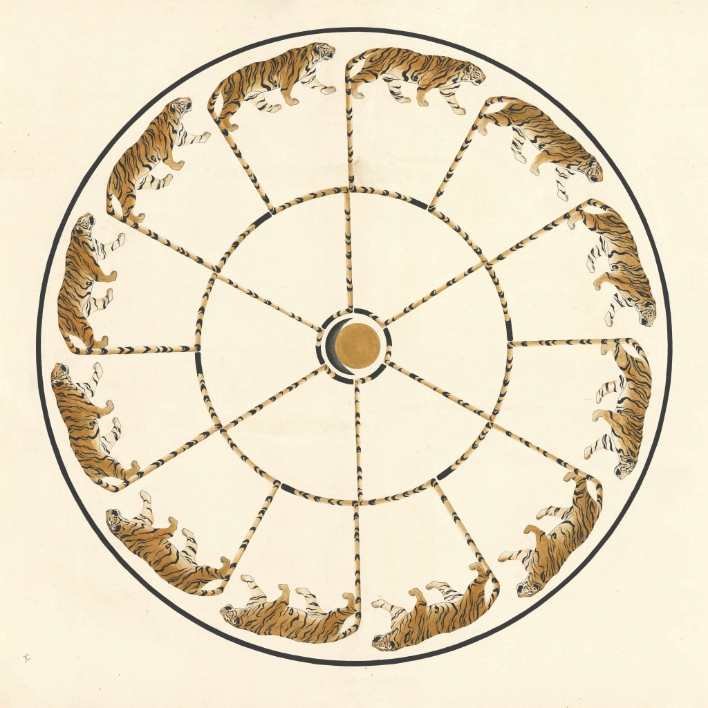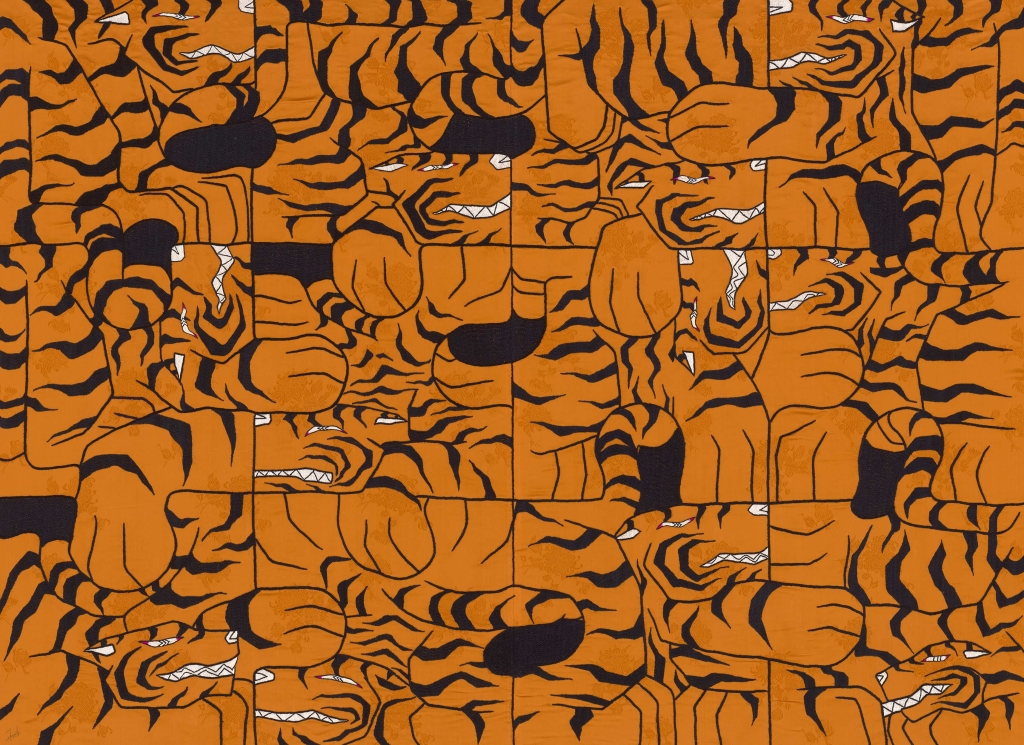 「療癒」一展中唯一的女性藝術家金柏麗的作品則顯得有些特殊,這位留學美國的年輕創作者並未以家鄉的傳統唐卡範式為創作基底,反而以「虎」為主要視覺語言,她在這種猛獸身上看到自信而自愛、獨立而莊嚴,也看到蘊藏著的美與力量,在圖像中植入「尾巴」(tail)與「故事」(tale)的雙關意涵,透過釋放自己的內在圖像,嘗試為亞洲女性編織新的生命敘事。在金柏麗此次展出的作品中,虎的主題以圓輪、迷宮等集合形態出現,表達對於不同的生命體驗路徑、對於種種生命選擇之可能的探索。