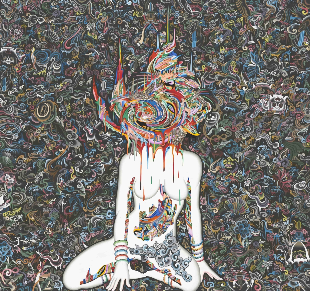 隨時間推移,夏爾帕作品與其生命經驗之間的「回應」關係愈發顯著。自2018年起,夏爾帕的生活與工作重心逐漸遷回家鄉加德滿都,除疫情期間滯留美國外,大部分時間裡他都居於此。這次「識界」展集結他近兩年來的新作系列,其中不乏包含元素抽象化處理、渦旋畫面、片斷分割式的多拼畫面等造形手法。這些造形手法的出現,一方面呼應了他敘事重心的悄然改變——回到原生環境中,離散身分開始變得模糊、變得不那麼重要——;另一方面,回到以傳統唐卡為文化土壤的脈絡中,對於早已進入當代藝術創作多年的他而言,不可避免地再度回到對「若不遵守傳統規則、是否還依舊保留對傳統形式的尊重」的自問與探索中。