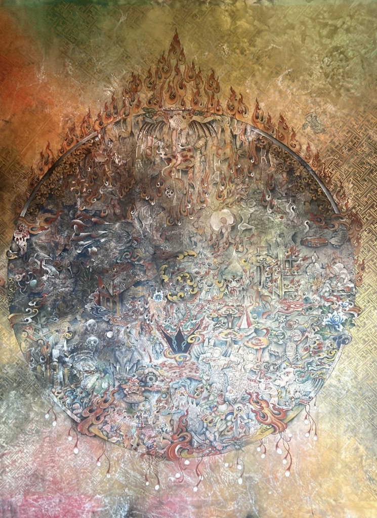 師從訶莎.卡瑪的金寶.旺楚克未及不惑之年,為不丹最年輕的唐卡大師之一。他以層出不窮的創意結合傳統範式與當代圖像,在具象與抽象、莊嚴虔信與離經叛道之間游刃有餘。身為千禧世代的他感同身受於種種當代議題,此次展出的四件作品創作年代跨越十年,可見其在傳統繪畫結構、細膩筆法中編織多層次元素,一方面連結不丹的美學傳統,另一方面深切探尋當代人的精神境遇。