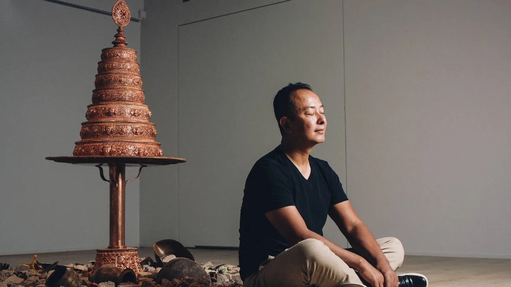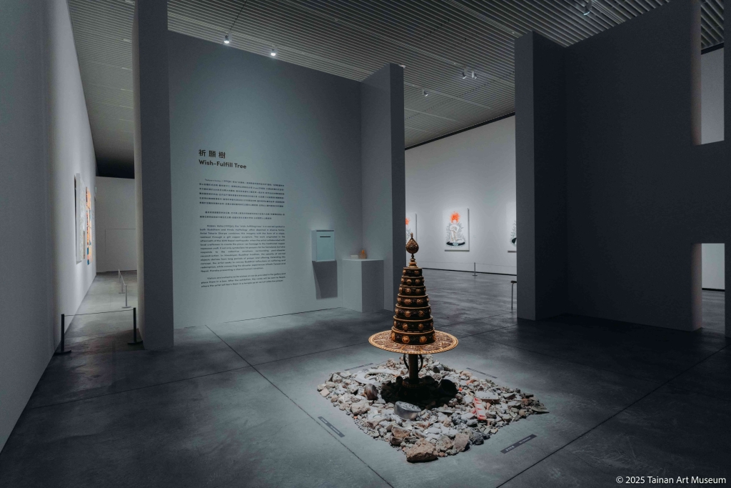 約二十年前,當夏爾帕逐漸開始自己的當代藝術創作生涯時,曾受著名的希克中國當代藝術收藏展「麻將」、以及另一聚焦南亞當代藝術的展覽所啟發,看到來自擁有古老文明國度的當代創作者,如何透過水墨、細密畫等傳統技法表達當代議題。除個人化創作以唐卡技藝為基礎外,他近年也進一步與尼泊爾傳統工匠合作,將銅鎏金技法運用於雕塑之中。這次展出的幾件鎏金翻銅雕塑中,也包括一件特別為臺南展覽創作的《祈願樹》,其傳統浮雕佛塔造型,既蘊藏尼泊爾與臺灣同樣多地震的自然環境之下的祈福心境,也是夏爾帕試圖在宗教與當代觀光消費這光譜兩端之間,為這種傳統工藝重新賦予藝術鑒賞價值的新嘗試。值得一提的是,夏爾帕回到自己的家鄉加德滿都後,除個人創作、與傳統工匠合作外,也透過創辦Takpa Gallery和致力於教育和駐留項目的非營利組織Himalayan ART Initiative,為當地藝術生態引入活水。2023年紐約亞洲協會(Asia Society)特別授予他「亞洲藝術變革者獎」(Asia Arts Game Changer Awards),正彰顯其在當代藝術生態中的貢獻。