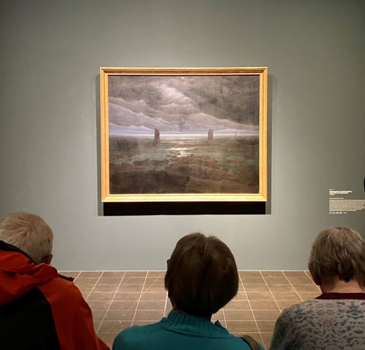 在「領土:夢之國度」展間中,藝術家艾莉娜・布羅瑟魯斯(Elina Brotherus)與沈昭良的作品形成一場關於觀看姿態的辯證。兩位藝術家皆在畫面中納入人物身影,有時正面、有時背面,延續並反思觀看的傳統。布羅瑟魯斯的影像中,她或突然轉身直視觀者,或緊抱樹木、身體傾斜、面無表情地介入風景,主動質疑觀看的邏輯;而沈昭良則將鏡頭推向城市邊界與基礎設施地帶——工業遺構、公路轉角、港口景觀。畫中人物背對鏡頭,甚至隱沒於霧氣與暮色之中,不再是觀看的主導者,而是被動的見證者。為呼應這種觀看結構,展場以白色霧紗牆塑造出「霧中觀看」的空間經驗。觀者不再是清晰的觀看主體,而是逐步被模糊邊界包圍,置身於一個時明時滅、難以聚焦的視覺場域。這一安排呼應了展間開頭所提及的卡斯帕・大衛・弗里德里希(Caspar David Friedrich)經典之作《霧海上的旅人》——山巔背影的男子象徵著現代主體對自然的凝視與掌控。然而,本展的空間設計卻反其道而行,以幾座白色薄紗牆讓觀者化為「失焦者」,在觀看與被觀看、掌控與迷失、主體與他者之間不斷切換與游移。當影像透過霧紗隱約透出一抹光時,觀者必須主動靠近、調整角度,才能重新對焦並與作品建立聯繫。