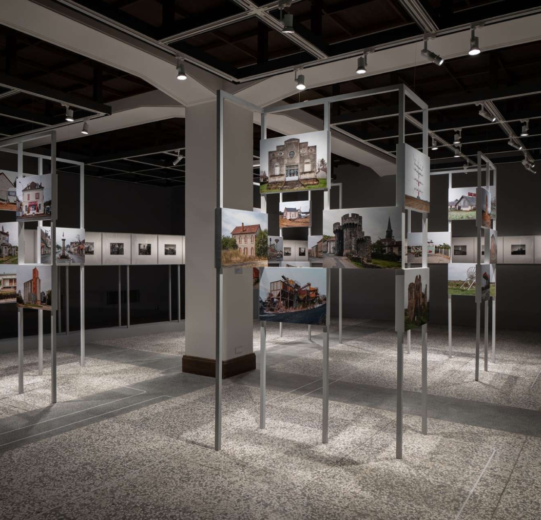 「領土:踏查表象」展間展開一片由圖像與地理交織的想像之地。法國雙人組埃里克・塔布奇(Eric Tabuchi)與內莉・莫尼耶(Nelly Monnier)自 2017 年起推行《自然區域圖集》(Atlas des régions naturelles),踏查法國境內非官方的「自然區域」,記錄那些不屬於建築正典、卻承載地方生活的「無名建築」。在本展中,他們將臺灣地理中心疊映於法國中部,生成虛構卻富想像力的「複寫地圖」與「平行國度」,並以鋁製框架構成可穿行的圖像地景——觀者在「他方台灣」中成為測量者與參與者,穿梭於熟悉與陌異之間。展間四周環繞著姚瑞中的《巨神連線補遺》(2018–2024),影像宛如環形屏障,帶來「舉頭三尺有神明」的臨場感。這些盤據臺灣地景的巨大人造物——佛像、神將、紀念碑、政治標語牆——既是宗教與觀光的標誌,也是視覺權力與地景意識形態的佔領,甚至構成一種「空間殖民」。相比之下,塔布奇與莫尼耶的彩色影像如民族誌,梳理法國鄉間的視覺遺產與庶民美學;姚瑞中的黑白攝影則如冷峻的田野記錄,直指那些看似尋常卻充滿政治與宗教意味的符號。在影像交織中,我們追問:地景由誰建構?那些佔據視野的「巨神」是偶然堆疊,還是文化工程?「家鄉」又如何在觀看中被塑造、記憶與神化?這些問題不僅指向鄉野與信仰,也延伸至城市:在生成與抹除之間,城市如何映照我們的集體記憶?