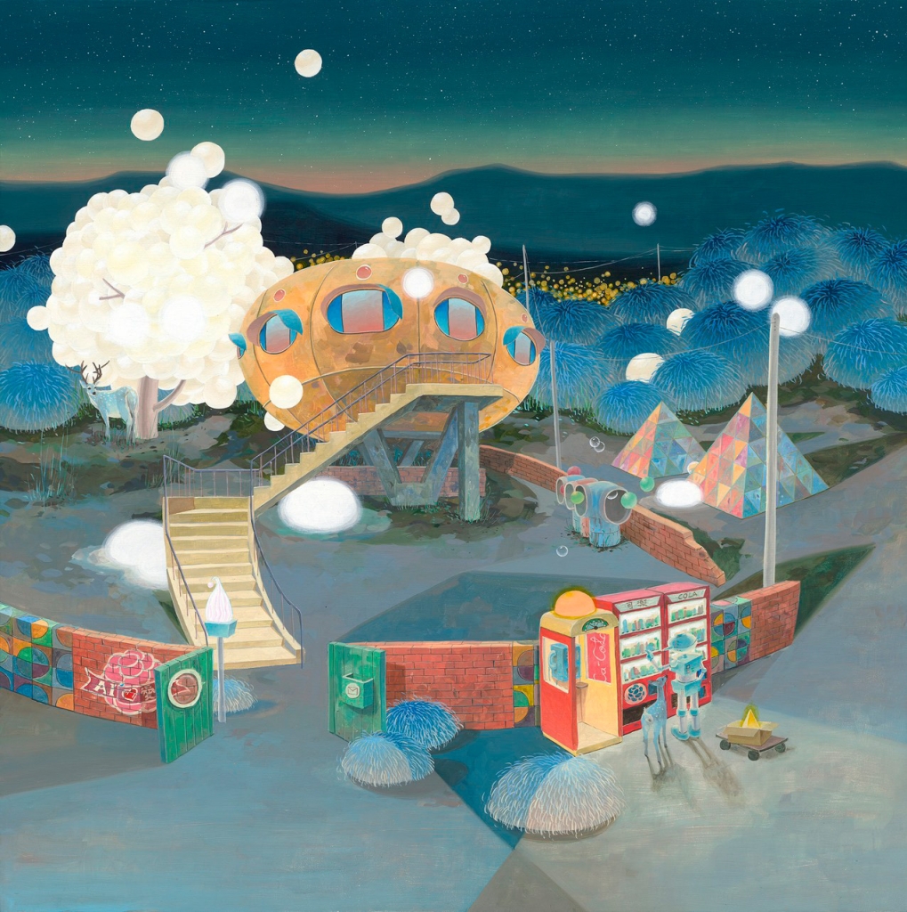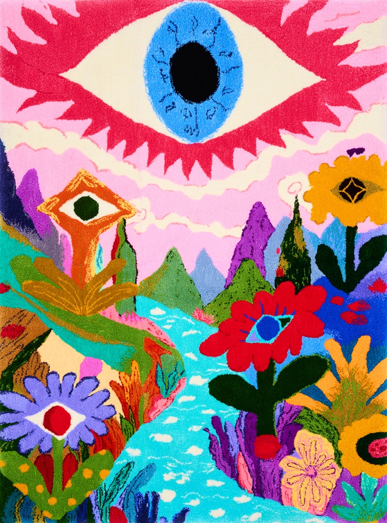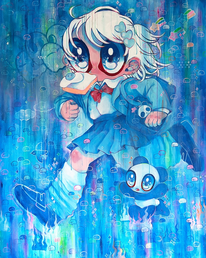 在本次展覽的藝術家中,亞歷克斯.費斯(Alex Face)、尾花賢一(Obana Kenichi)的作品延續了這一特性。例如,亞歷克斯.費斯(Alex Face)的「三眼兔子」角色擁有固定的視覺標誌,使其在不同場景中維持高度辨識度,而尾花賢一的角色則保有濃厚的日系漫畫風格,展現了流暢的線條與夢幻的色彩氛圍。相較之下,蓋瑞.亞默(Gary Armer)、雷沙 達巴斯(LeiSha Dabasi)、住舍(SUMISHA)的角色設計則更偏向具象,這些作品強調人物的細節與動態,即便仍具有漫畫的戲劇性,但在表現上更接近傳統繪畫,展現了一種超越漫畫風格的藝術性,而 雷沙 達巴斯(LeiSha Dabasi)以自身泰雅族的血脈與情感,以織物的臉譜與不斷出現的菱型符號貫穿其創作,昭示泰雅族在當今世界裡的獨特聲音,其不可抹滅的原始力量與精神性。