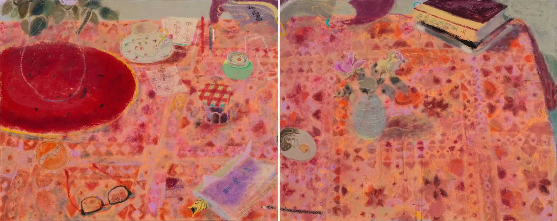 北京藝術家王玉平的藝術路徑能近取譬,擅長描繪日常場景、熟暱人物的他,本次展件以靜物為主,從常玉的東方趣味和灑脫線條中汲取精華,比起撕心裂肺、故作興奮的題材,他在沉靜中隨心發掘自我,尤其能藉由生活周遭看似稀鬆平常的傢飾與日用品,凸顯色彩和造型的樸拙之美。結合壓克力顏料與油畫棒,畫作《包》滿是豐富肌理,彷彿能在指尖膚觸喚起與包包相伴一路走過的共同記憶,這樣的刮擦與皺褶彷彿成為一種氛圍,瀰漫、融入背景。藝術家以粗細、濃淡不一的紅線勾勒出承載包包的座椅,椅墊上有雅緻的花草圖紋,椅墊之下的紅色是全畫面中最為銳利的色彩區域,強而有力地框住坐墊,撐起包包主體,相襯之下,椅背顯得霧濛濛的,椅背上的頭角更是沒了填色,只有白描,其隨性灑脫、不求精確寫實的精神與常玉相通;同樣媒材的《花桌面》場景與物件又更加豐富,桌布固然吸睛,然而桌布之上更有玫瑰、盆栽、眼鏡、書卷、便箋、茶具,創作年份橫跨2018到2021年,因此這些物件未必同時出現在桌上,或可視同縮時並置的生活寫照,特別值得一提的是畫面上方捧著北齊書的雙手,幾乎透明無量體,與其中一指戴著的碧綠戒指形成強烈對比,令人莞爾。