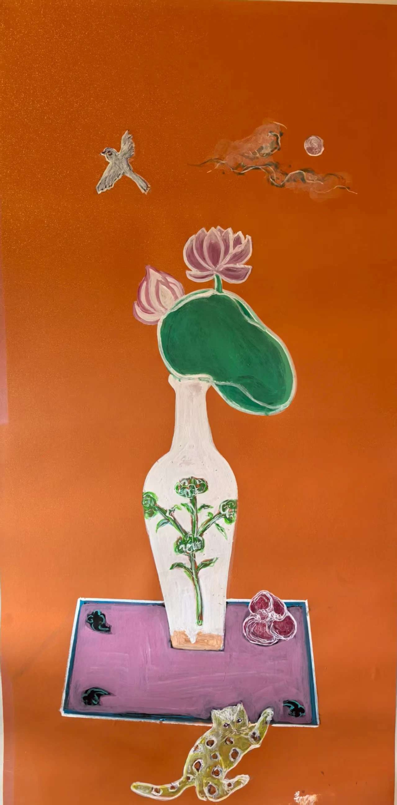 鄭在東《磁州窯瓶的荷花》,壓克力紙本,137 x 70 cm,2025。(圖片提供:一條藝術中心)