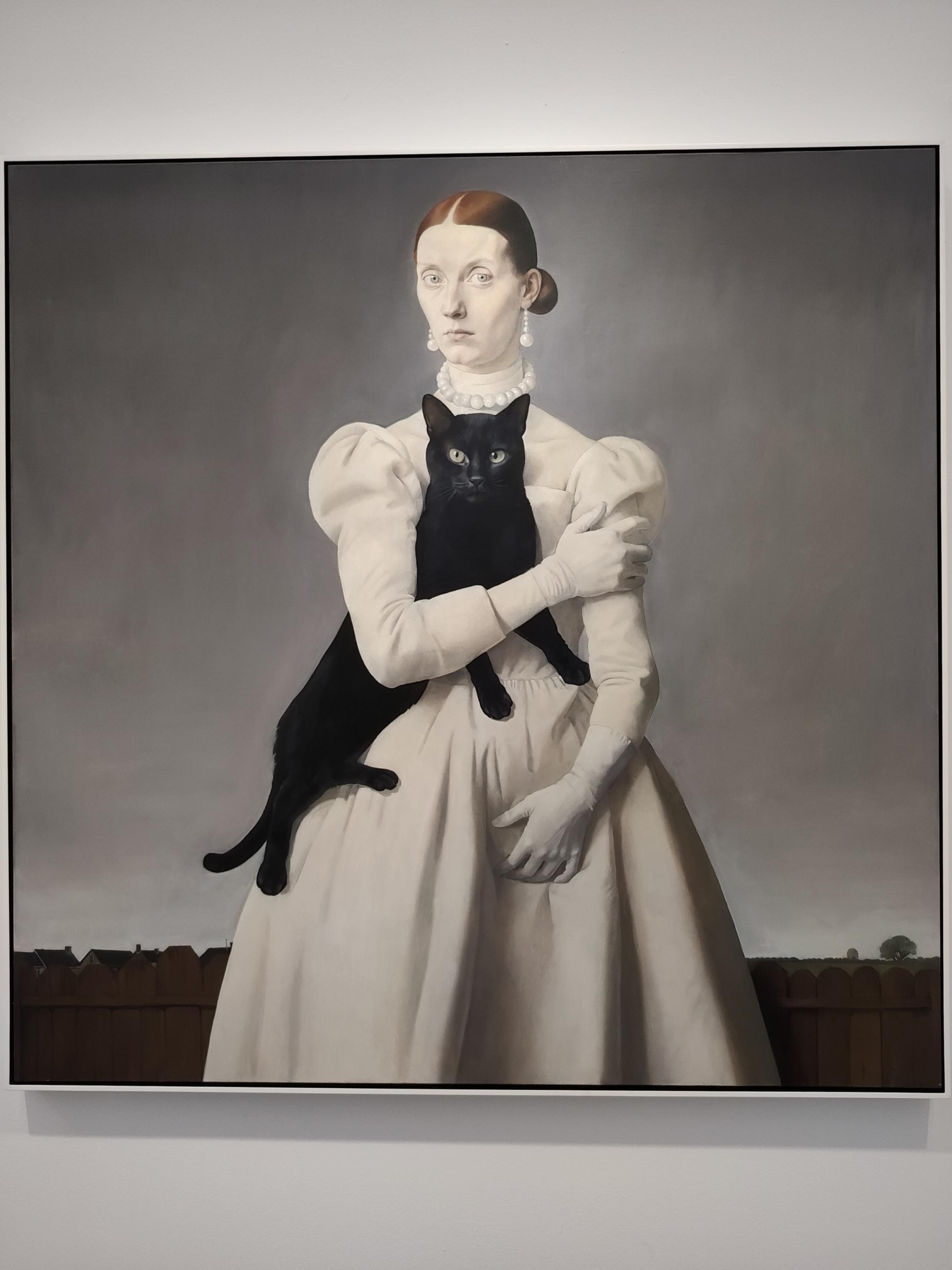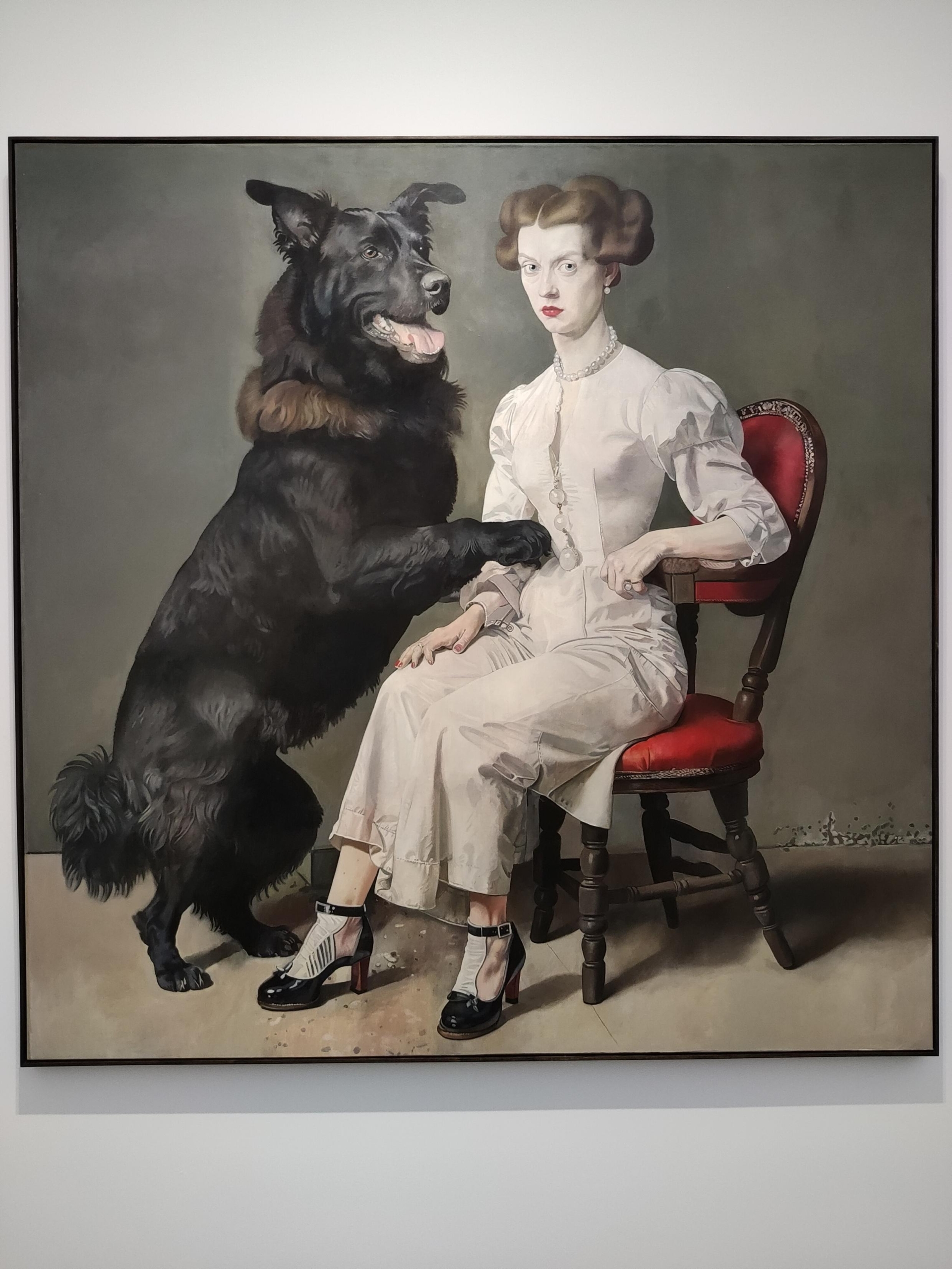 最後「AI共創篇章──馮.沃爾夫的再進化」中,他以NVIDIA 4090 支援的開源系統 ComfyUI加入自身過去的創作,反覆訓練累積成為他專屬的生成工具,在油畫作品與數位輸出並置的同時,觀者得以一窺「直接繪畫」(Direct Painting)和「間接繪畫」(Indirect Painting)的差異,並反思藝術靈光超越媒介的可能性,藝術家在與典藏的專訪中也提到了智慧(Intelligence)與主體性(Agency)的分別,並強調自己創作以「人文主義」為圭臬。以《深黑的優雅》、《泰然自若》、《她的黑暗靈伴》是沃爾夫常見的動物與女主人構圖,或者作為鏡射陪襯,或者顯示女子的自信沉著,具有安定凶險、掌控全局的能力,或者是守護者與被守護者的關係。而《奔跑者》呈現兩位女子誇張的情態,藝術家說,這幅作品是他較早的嘗試,沒想到獲得廣大的迴響,甚至有中東的粉絲私訊表示強烈的共鳴,然而藝術家並不以單一情緒概括這些激烈的面部展現,他說這可能是狂喜,可能是激情,也可能是毫不受限的呼喊,可以確定的是,這不會是男性凝視下過於化約與污名化的歇斯底里。展覽同名作品《花園堡壘》是藝術家以臺灣與高雄市立美術館為靈感的作品,表面上以「花園」呈現美術館周邊的綠意,投射對於伊甸的想像,細看充滿氣泡與白鴿的玻璃圓柱則是呼應了早期真空實驗的典故,沃爾夫在此畫背後還有此作更早期的演算版本,並且搭配了他想像中的「福爾摩莎」全貌,並非寫實的臺灣島,而是如晶片一般的「凡爾賽花園」鳥瞰變體。
