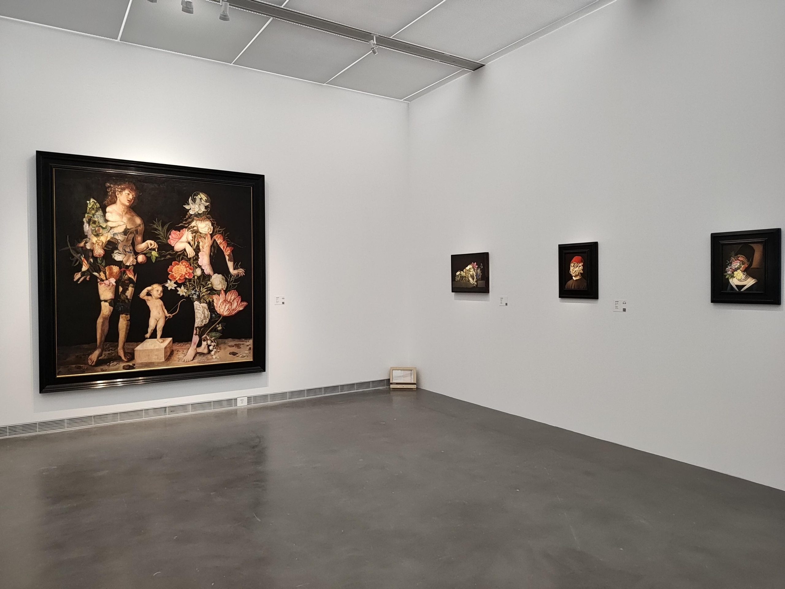 第二部分「名畫協奏曲──從文化基因庫向經典致敬」展區一進來就很難不受到《物種起源》的吸引,可以與達文西的《岩間聖母》相對而觀,這達文西幅畫作有兩幅主題名稱均相同,這裡是以英國國家美術館為本的詮釋,連金碧輝煌的畫框都如出一轍,聖母聖嬰均面無血色外,一隻出乎意料的小猴子正伸手似欲觸碰,使得原本明確的經典宗教意象變得神秘曖昧而不可捉摸。《誓言》改自賈克-路易・大衛的名作《荷拉斯兄弟之誓》,原畫創作者及背景都與支持法國大革命習習相關,因而既傳奇又充滿爭議性。這幅畫或許是整場中最具有男子氣概的作品,也因此更強烈地映襯了其後的轉折。《聖喬治與龍》是在沃爾夫創作生涯與本展中都具有承先啟後作用的一幅關鍵作品,一方面本畫作中的女性轉為強勢角色,另一方面也是沃爾夫首次結合人工智慧完成的畫作。