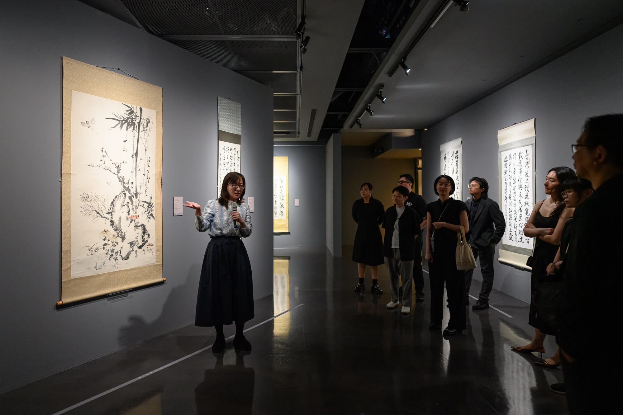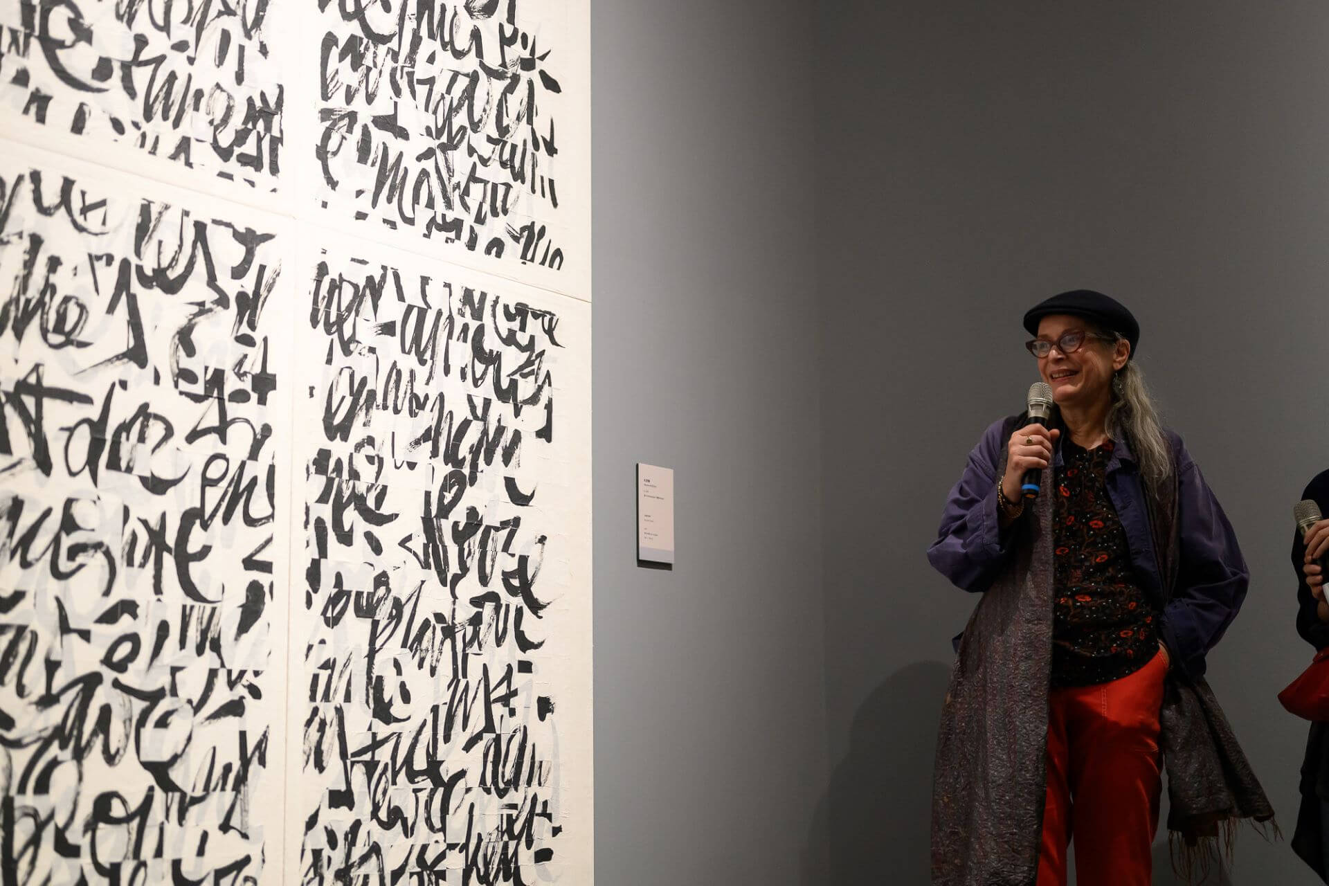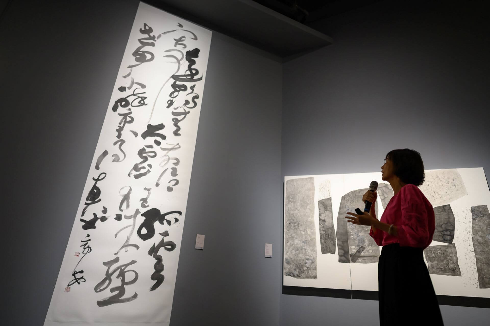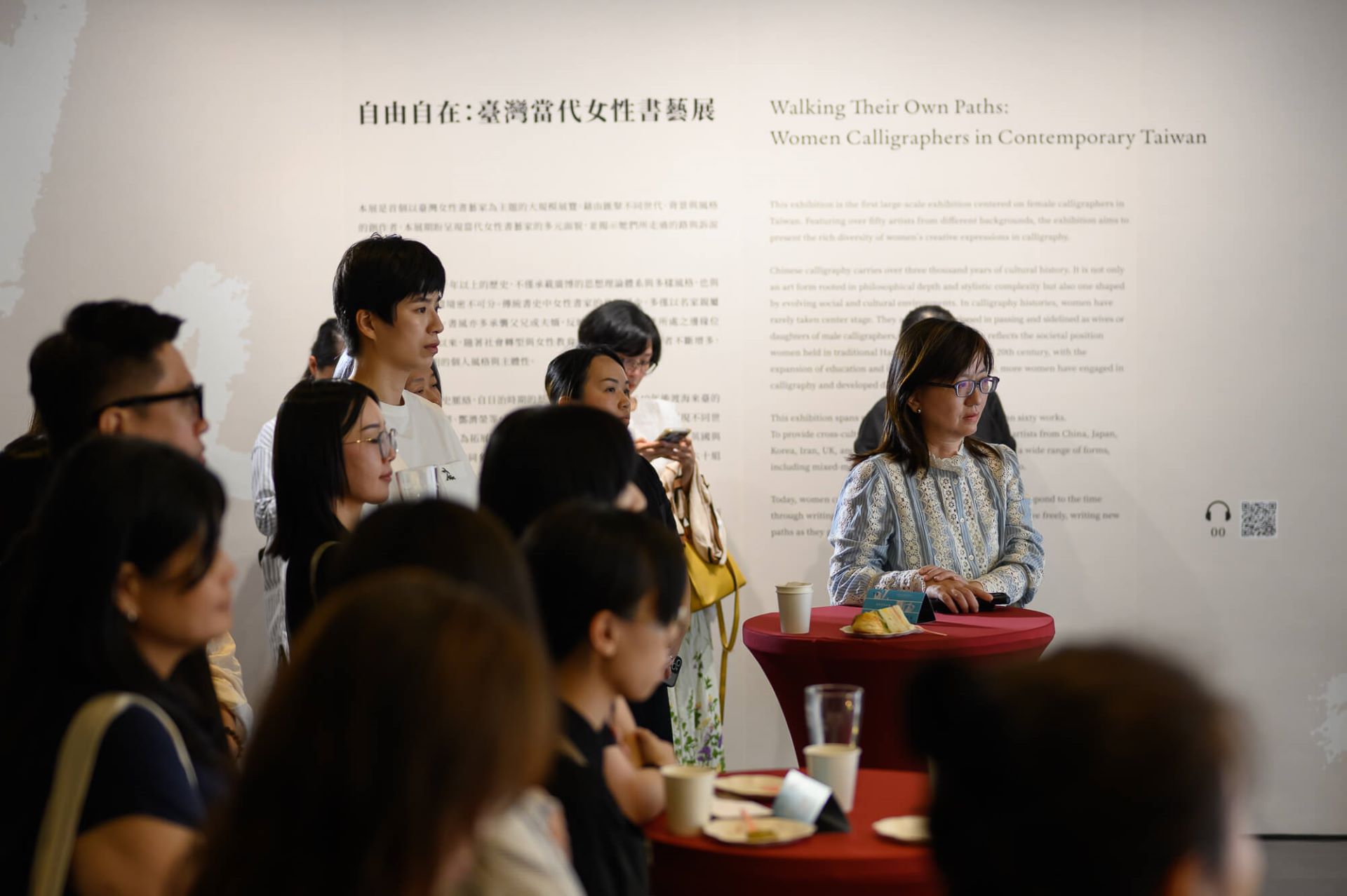 當日藝術家莊千慧、林佳穎、中華漢光書道學會皆到場分享創作理念,法國藝術家杜菁蘭 (Nicole Dufour)更從法國來臺驚喜現身,揭開作品〈交錯的秘密〉中的創作故事。桃園市立美術館展覽組組長洪郁喜介紹本館典藏品 Shirin Neshat 〈Offerings〉時指出,藝術家以黑白攝影與波斯書法重返早期創作語彙,將波斯詩人Omar Khayyam的詩句書寫於女性身體上,形成跨越文化、歷史與精神性的視覺文本。她表示,作品中酒的題材不僅是物質象徵,更指向「共享」與「凝聚」的文化力量,使觀者能在觀看中理解Neshat 如何以身體作為承載記憶與詩意的載體,並回應其長年關注的身份、性別與流亡議題。