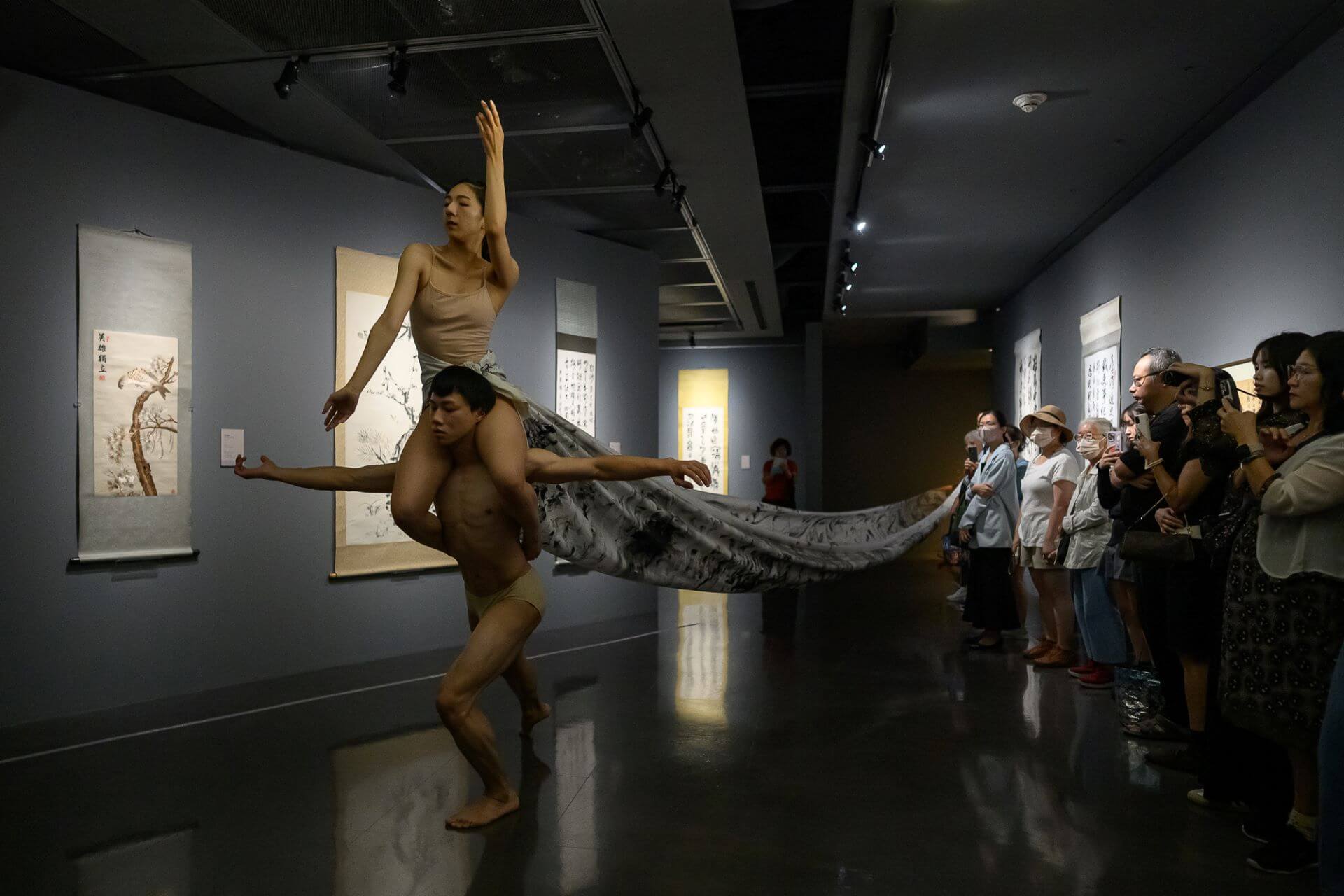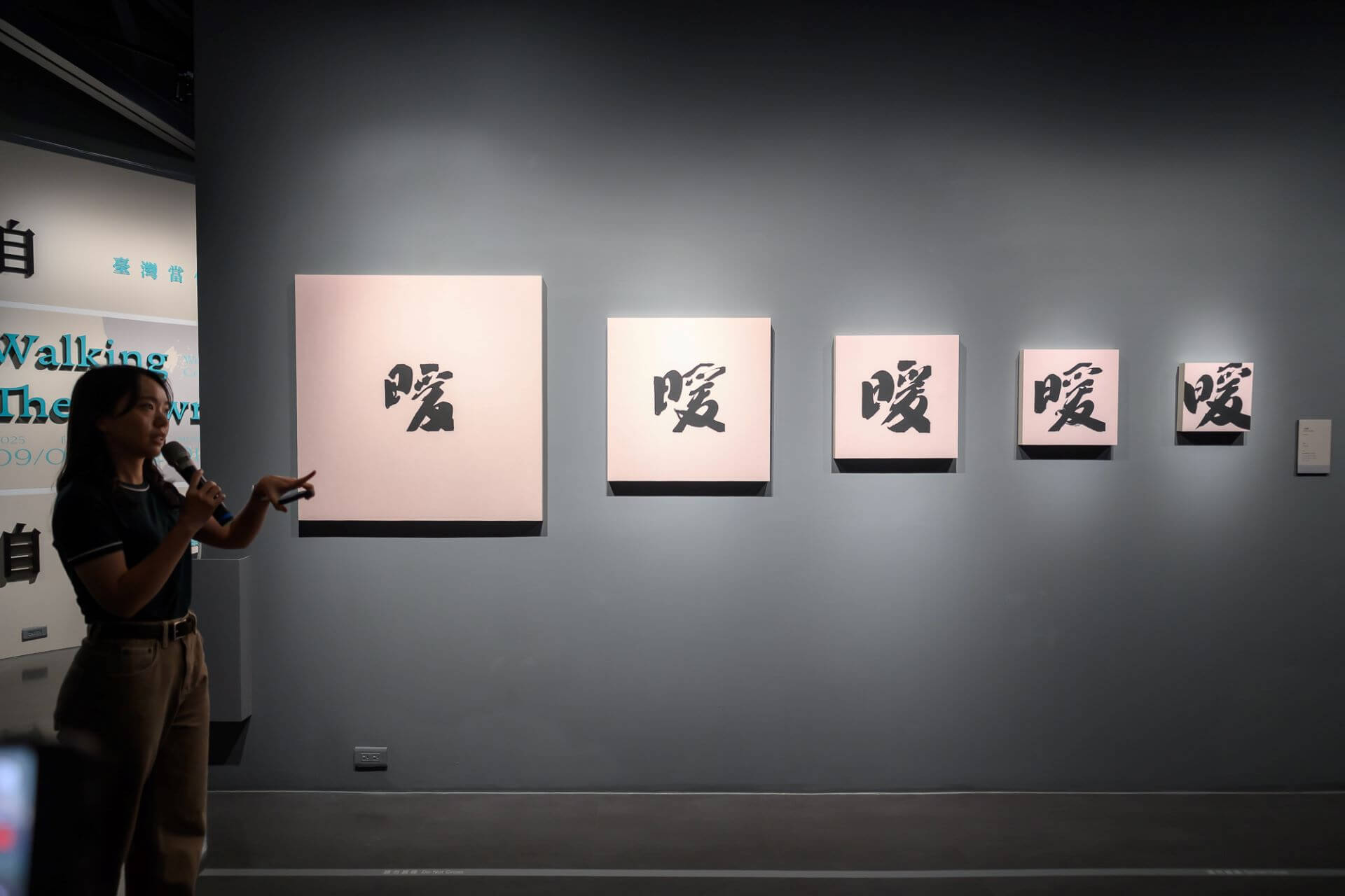 首場「跨界」於9月5日登場,由音樂人王榆鈞在夜色中開場,邀請觀眾沉浸於書藝與聲音交織的情感之中,讓展覽空間在夜晚展現全然不同的氛圍。策展人盧慧紋當日特別介紹張李德和在藝術史上的重要地位;藝術家袁慧莉、柏巧玲、川尾朋子、吳孟珊、賴麗雲、鄭芳和(惠美)等人亦親臨現場,分享創作理念以及她們以女性創作者的感知與書寫經驗。藝術家鄭芳和(惠美)介紹作品〈綑綁臺灣40年〉時,展場中響起觀眾隨作品內容哼唱的回應,讓那一刻在夜色中格外動人。