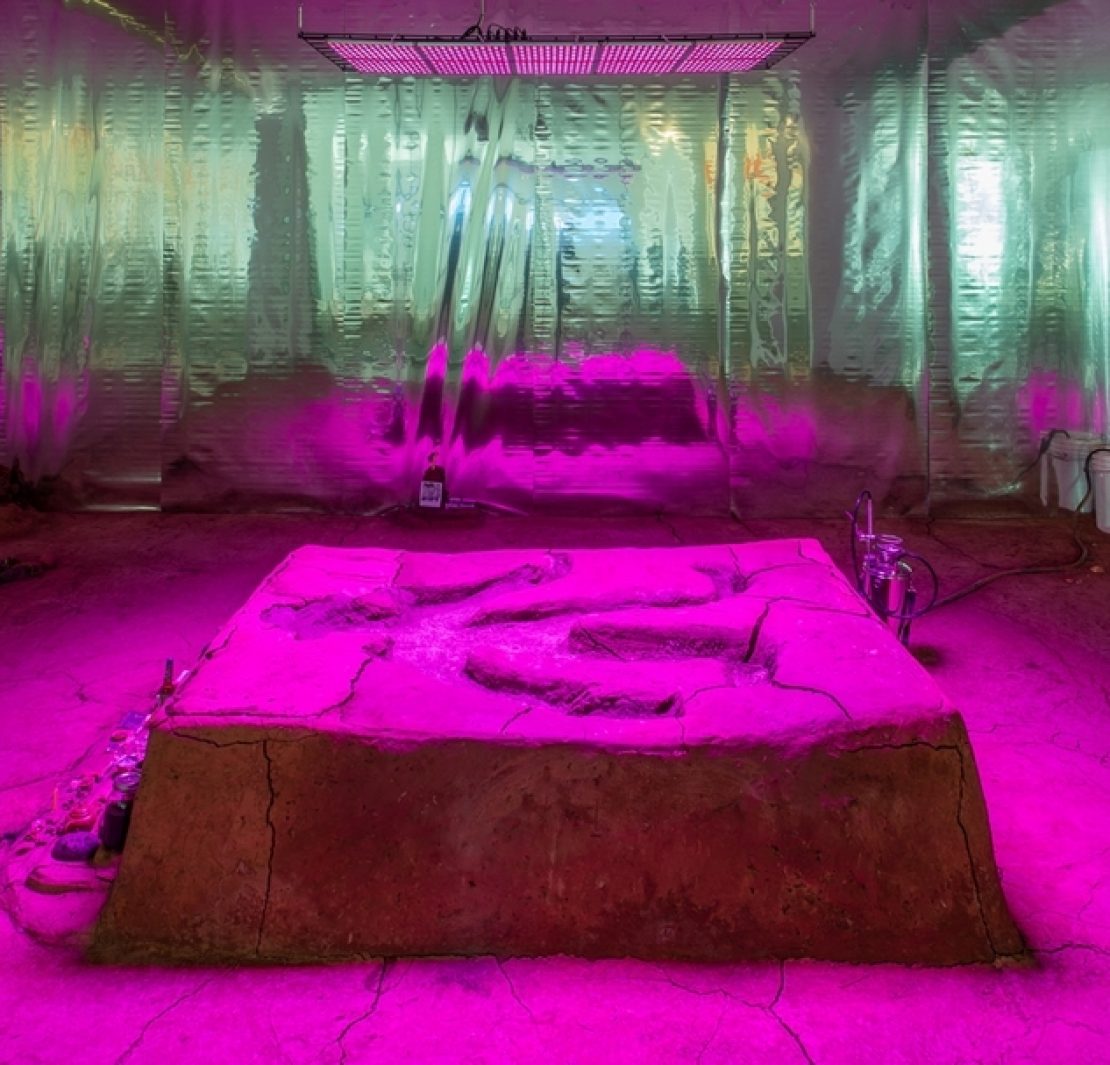 尼古拉斯.曼甘(Nicholas MANGAN),《白蟻經濟》(Termite Economies),石膏、泥土3D列印、高分子塗料、塑合木板、有色軟鋼、日光燈、四組Sony Trinitron PVM 9042QM螢幕、循環播放錄像檔案、四頻道環繞音響播放白蟻示警聲響,2018。(藝術家與澳洲墨爾本薩頓畫廊提供)