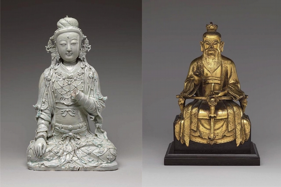 左:元〈景德鎮窯青白瓷菩薩坐像〉,Edgar Bromberger捐贈紀念其母Augusta Bromberger,1951;右:明初〈陳彥清造鎏金銅老子像〉,Friends of Asian Art Gifts購藏,1997。(©The Metropolitan Museum of Art)