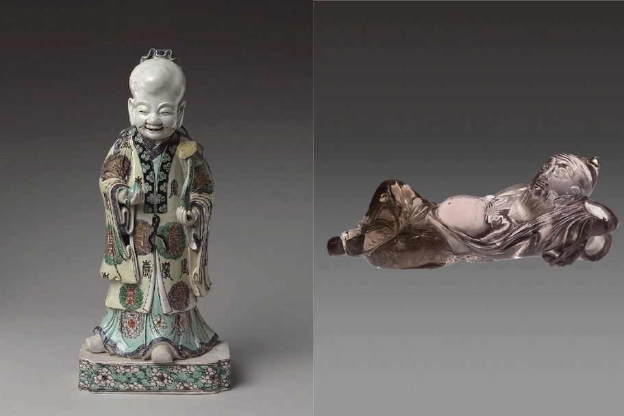 左:清康熙〈景德鎮窯三彩描金壽老〉,Benjamin Altman遺贈,1913;右:清〈水晶雕醉臥仙人〉,Friedsam舊藏,Michael Friedsam遺贈,1931。(©The Metropolitan Museum of Art)