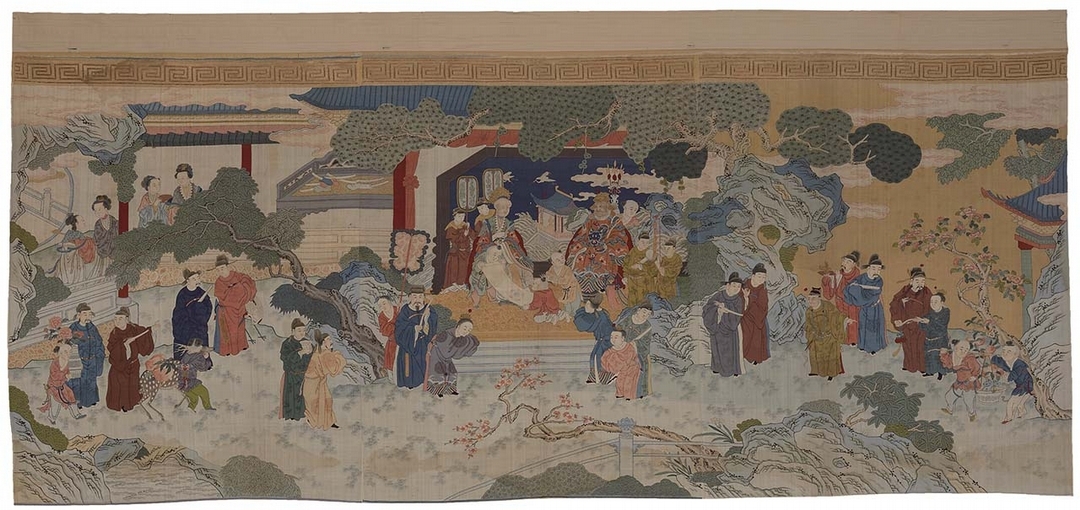 最後,清晚期〈緙絲賀壽圖〉應可作為本展主題的總結代表。畫面中央一對穿著華麗服飾的年邁夫妻,端坐廳堂裡接受來自四方人士的恭賀獻禮。他們前面有三名孩童,正打開祝壽畫幅邀請觀賞,而左右兩側各有僮僕扛著壽桃與牡丹依序前來。蒞臨的貴客來賓,男性多身著正式冠服,出現在前景部分,而女性則處於左上方的閨閣裡。整幅場景布置彷若仙境,不僅松梅長青且祥雲繚繞,人物生動設色鮮麗,充滿吉祥歡樂氣氛。此款緙絲掛毯屬於一組大型裝飾面版之一,通常陳設在大廳當中,以帶來福氣好運與健康長壽。