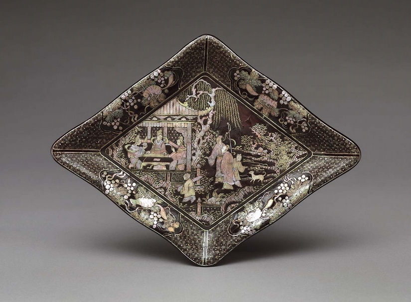 晚明〈黑漆嵌螺鈿遊園賞樂圖菱形盤〉,Florence與Herbert Irving 捐贈,2015。(©The Metropolitan Museum of Art)