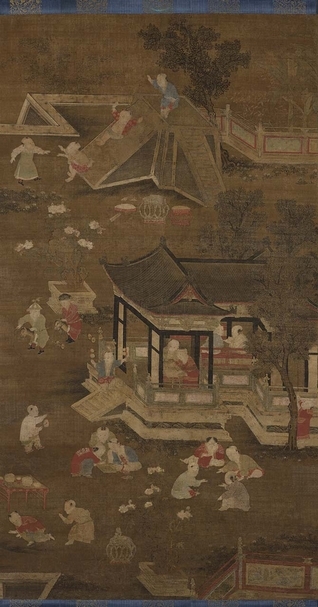 古代孩童豐富的嬉戲情景,還可在一件元末明初的〈嬰戲圖〉中見到。畫面上22位兒童正在玩各種遊戲,包括溜滑梯、騎木馬、搖鈴鼓和鬥蟋蟀等,表現出童稚天真活潑的動態樣貌。從畫中的豪華場景看來,此處極有可能是當時皇家宮苑庭園的某一角落,這些幼童具有皇子宗室的尊榮身分。在宋代畫院的圖繪傳統習作中,嬰戲圖一直是相當熱門的創作題材。若從服飾裝扮和表現手法來看,這件繪畫作品很有可能是在明初時繪製完成,反映當時朝廷對於古代畫院風格和畫題內容的推崇與關注。