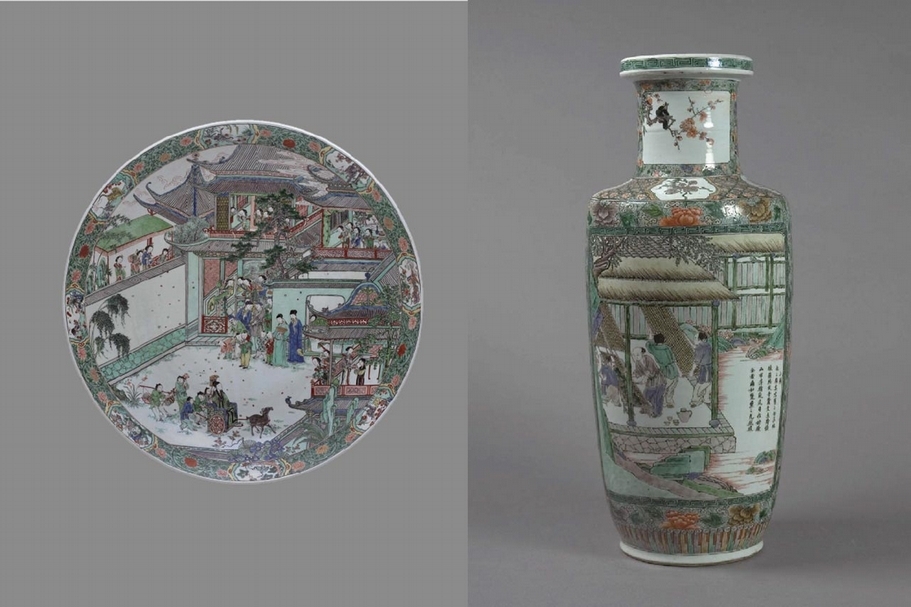 右:清康熙〈景德鎮窯耕織圖瓶〉,John D. Rockefeller Jr.遺贈,1960;左:清康熙〈景德鎮窯五彩擲果盈車圖大盤〉,John D. Rockefeller Jr.遺贈,1960。(©The Metropolitan Museum of Art)