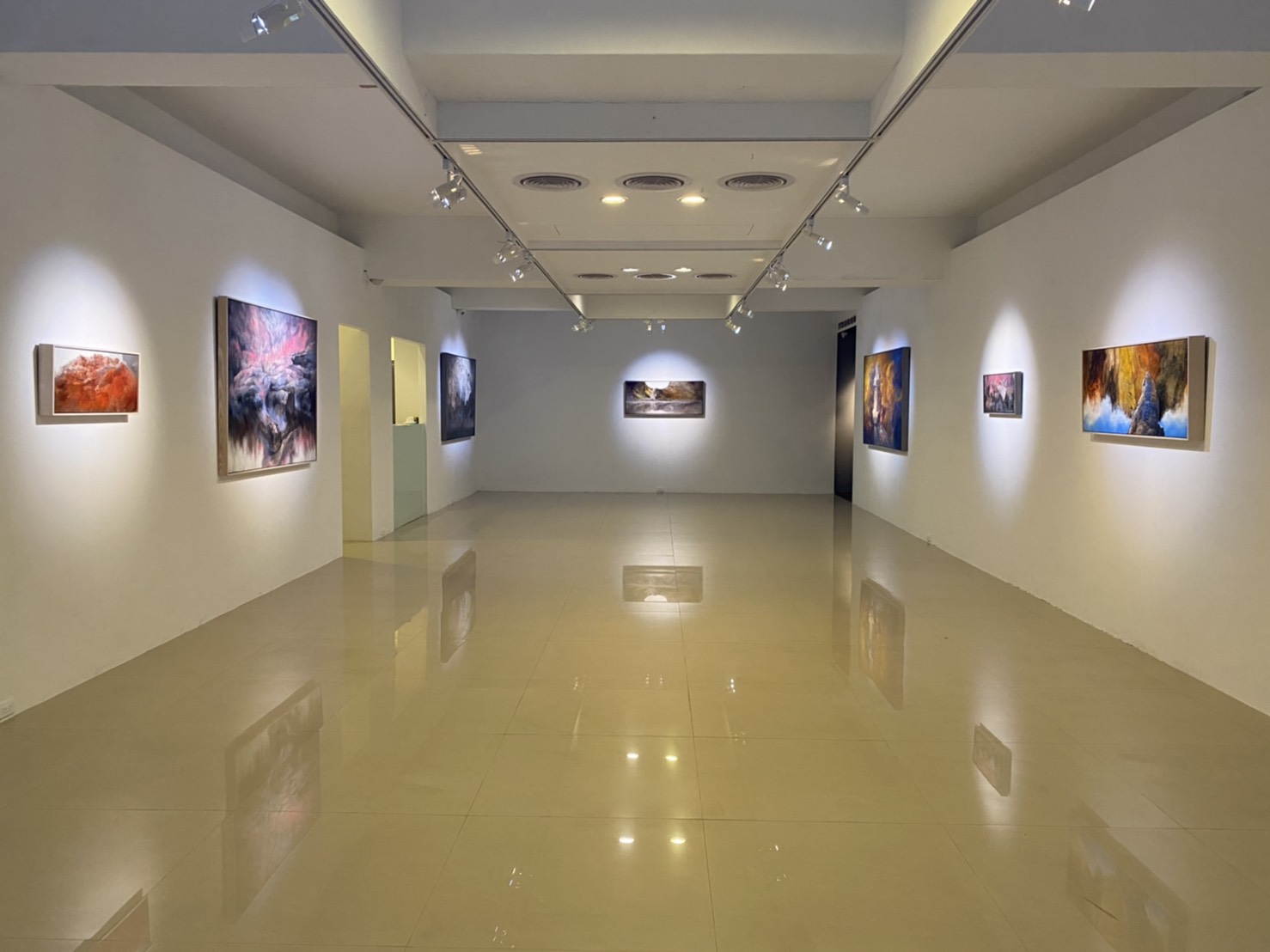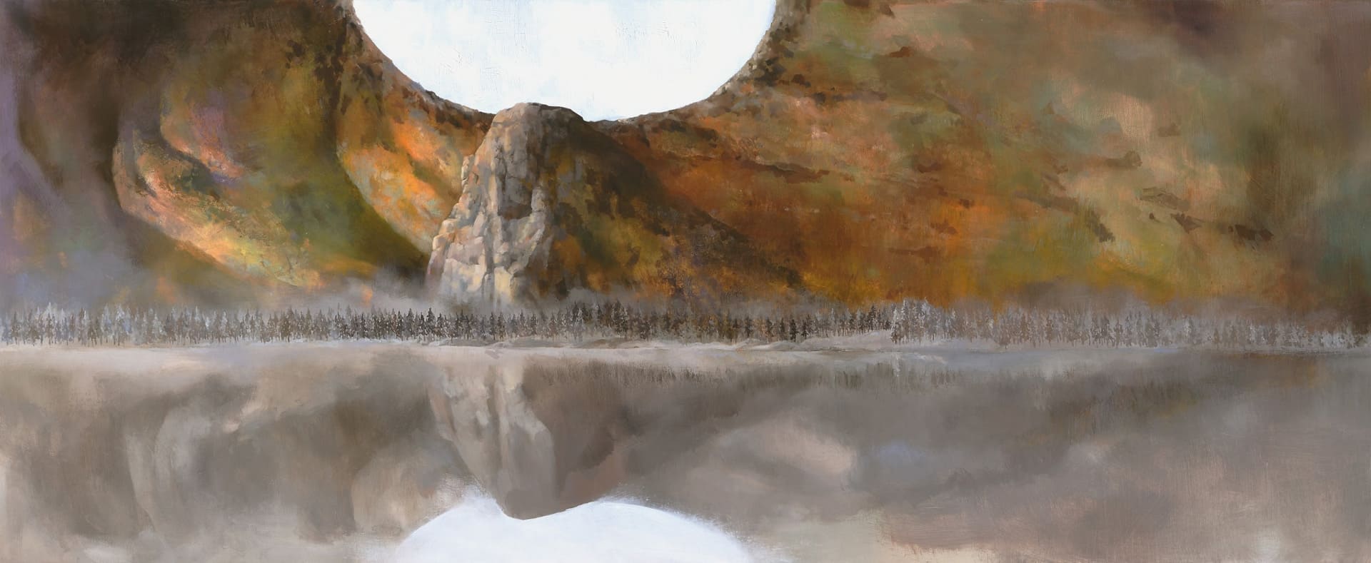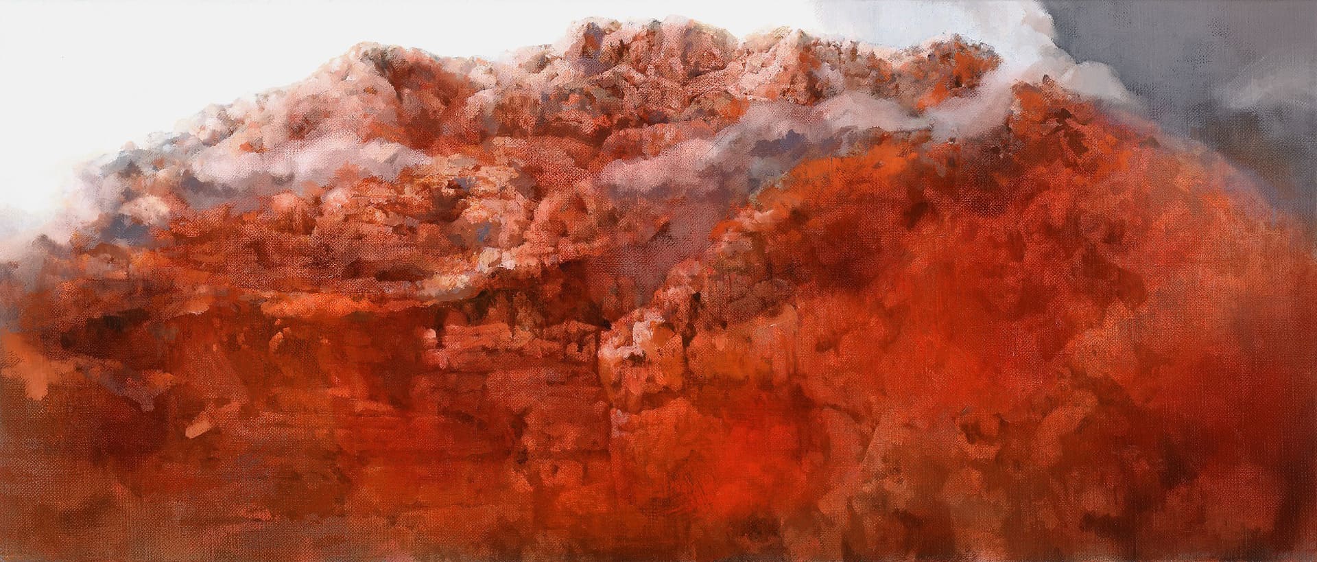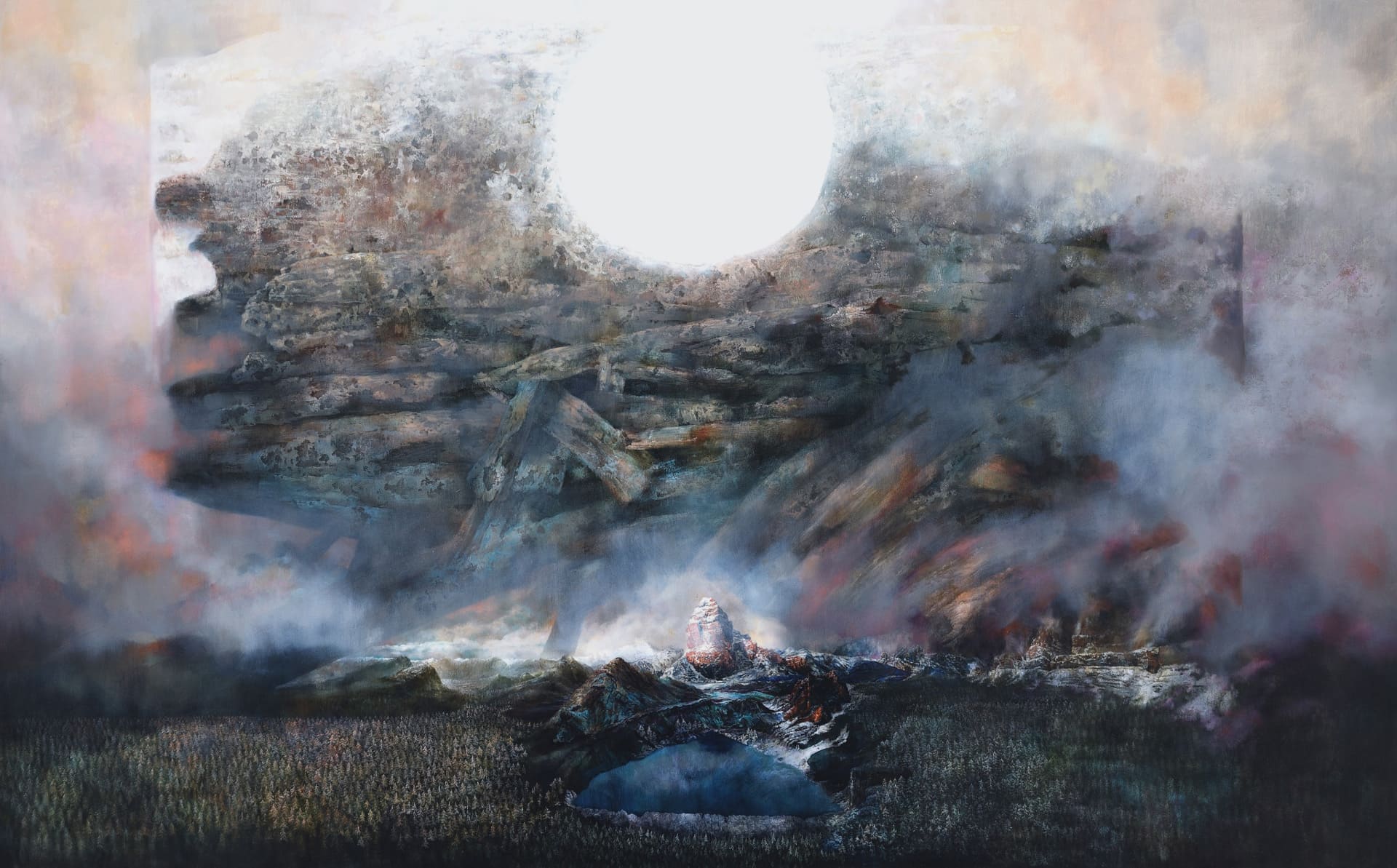 火紅的《赤山》以油彩誘惑著觀者,《獨矗》、《巨凝》沿襲了過往的山中景色, 藝術家描繪的山石與樹木往往在視覺上難以細辨,僅見粗糙的表面與礫石,而這些引發觀者曖昧觸覺感知的,正是藝術家虛構出「真實界」的重要一環,在符號與象徵系統之外,是靈魂的鏡射。《嵐澀》以200號巨大姿態掛於牆上,藝術家再次以精細筆觸建構了沒有名字、沒有座標的神聖場域,湖水映照著天空,巨木與白色圓形以突兀之姿橫亙於畫面之上,曾經的白色圓形符號仍然指向了異度空間,寺塔與城牆建築則讓人想起西藏拉薩布達拉宮與等待轉動的經綸,而流逝的究竟是誰的時光? 兩幅22×27公分的三號小品《山光》、《暗流》恰恰聚焦在時光與歲月的痕跡,它們分別描繪了山石與木紋肌理,石塊堅硬在午後豔陽下折射出光線,有溪水流淌據於一方,呈現了藝術家巧妙的筆尖技藝與寫實再現功力。