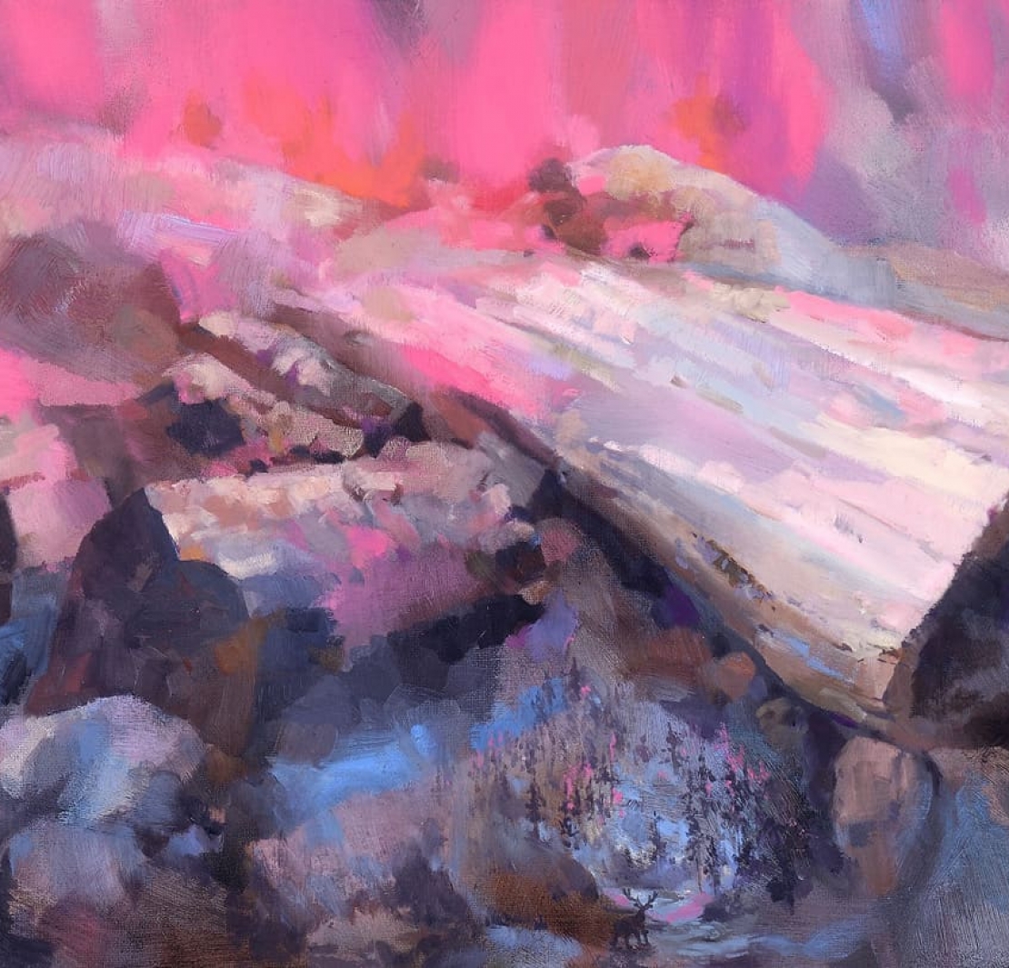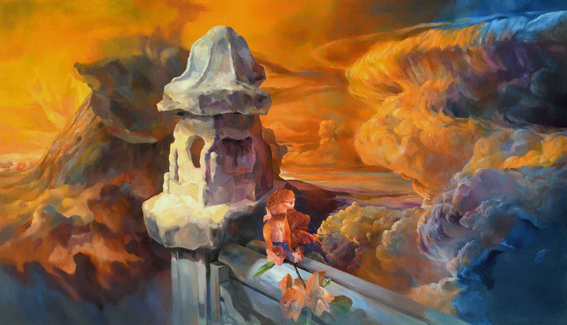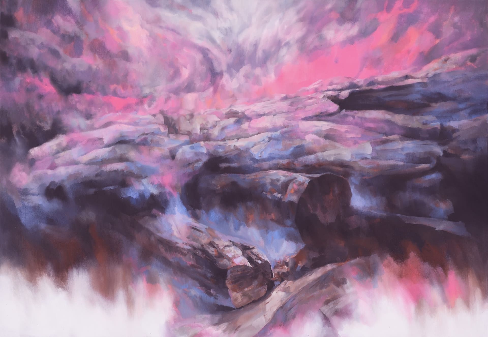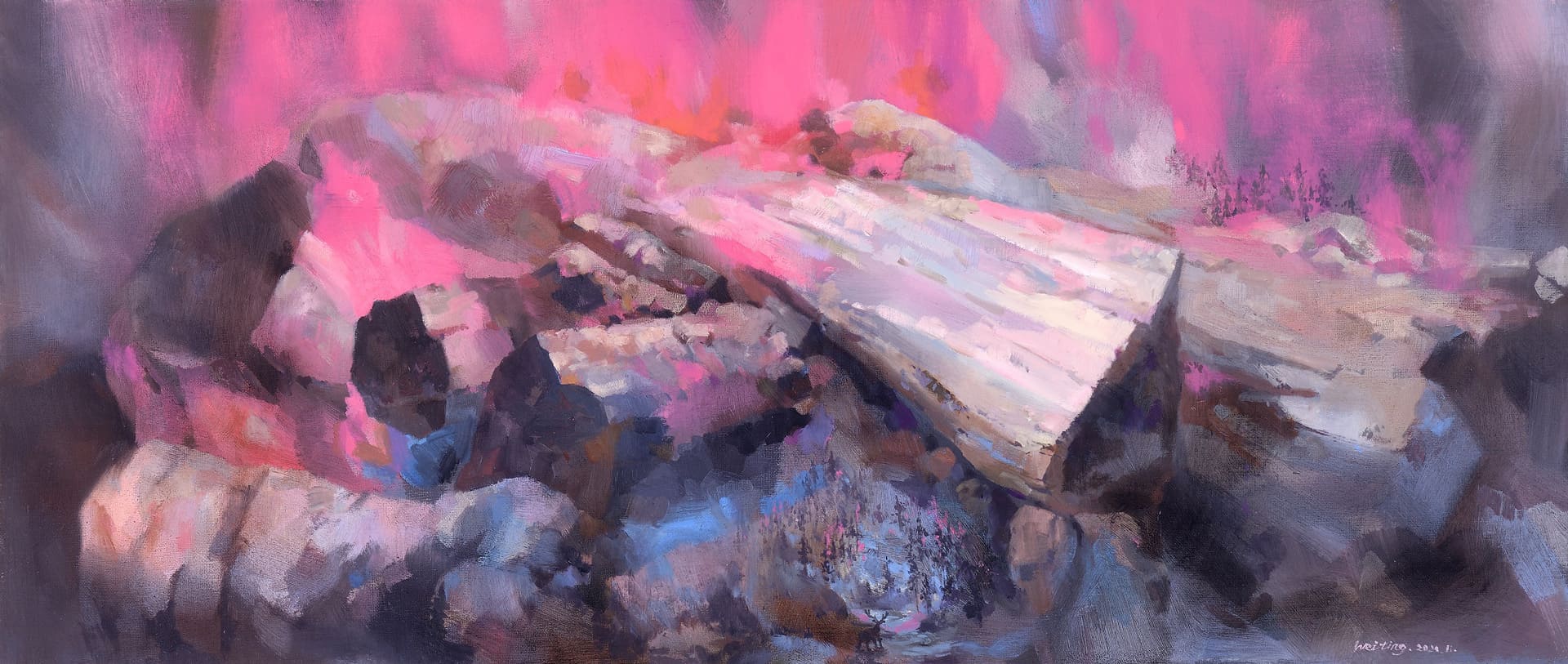 具象作品的標題命名往往引導著觀者的想像,閱讀的習慣讓藝術家的文字總帶著文學性與詩意,在此次「造山」個展中作品的命名甚至透露出藝術家暗藏其中隱晦的生死與靈魂輪迴觀點。所展出的「業火」系列作品,可以看到藝術家進行了風格與技法上的嘗試,畫作可以說是肉身覺醒與蛻變後的萃取。個展前,藝術家經歷過一場生死交關的試煉,對生命的體悟引發了激進嘗試與冒險,從色彩與畫面水份、動物細節、輪廓的掌握,都與過往寫實手法有所差異,精細的描繪被藝術家刻意捨棄,只剩下塊面與輪廓,一改原本琢磨再琢磨的細節,繁複的動作被徹底捨棄。在過往,這些局部的寫實雕琢是藝術家對心性的砥礪,一遍又一遍,學著山石讓自己得以淬鍊出堅毅。「業火」系列取其對地球的觀察,日益危殆的生態環境是地球上人們的共業,大火一次次焚毀森林,動物們倉皇逃生,讓觀者不捨新生悲憫。《業火I竄逃》與《業火II山火》裡出現了驚慌奔逃的小動物,藝術家初次嘗試在風景中植入活物,看似童真的粉紅色,被藝術家用來反諷世界的虛偽與矯情,指向暗黑的環保神話。