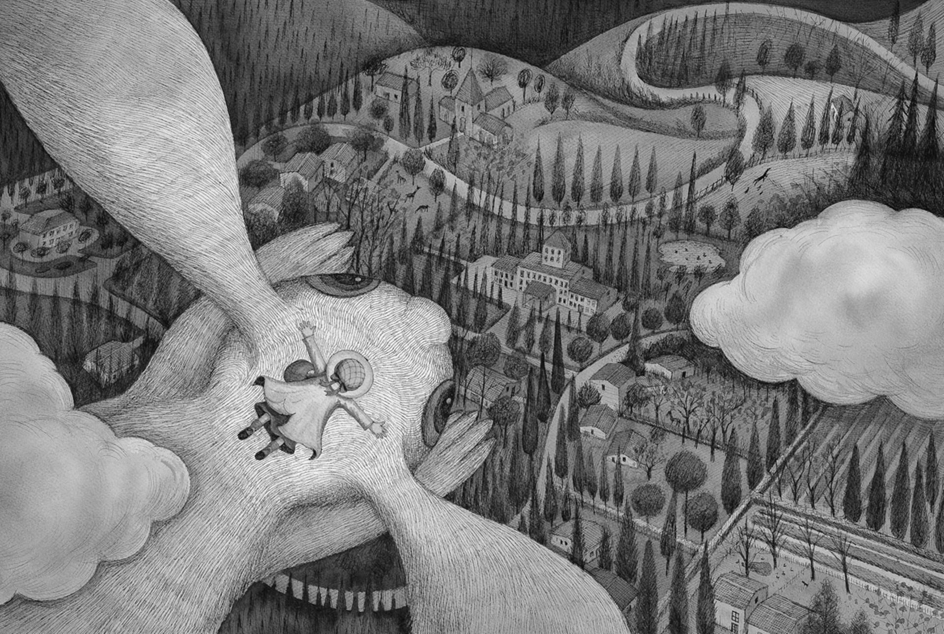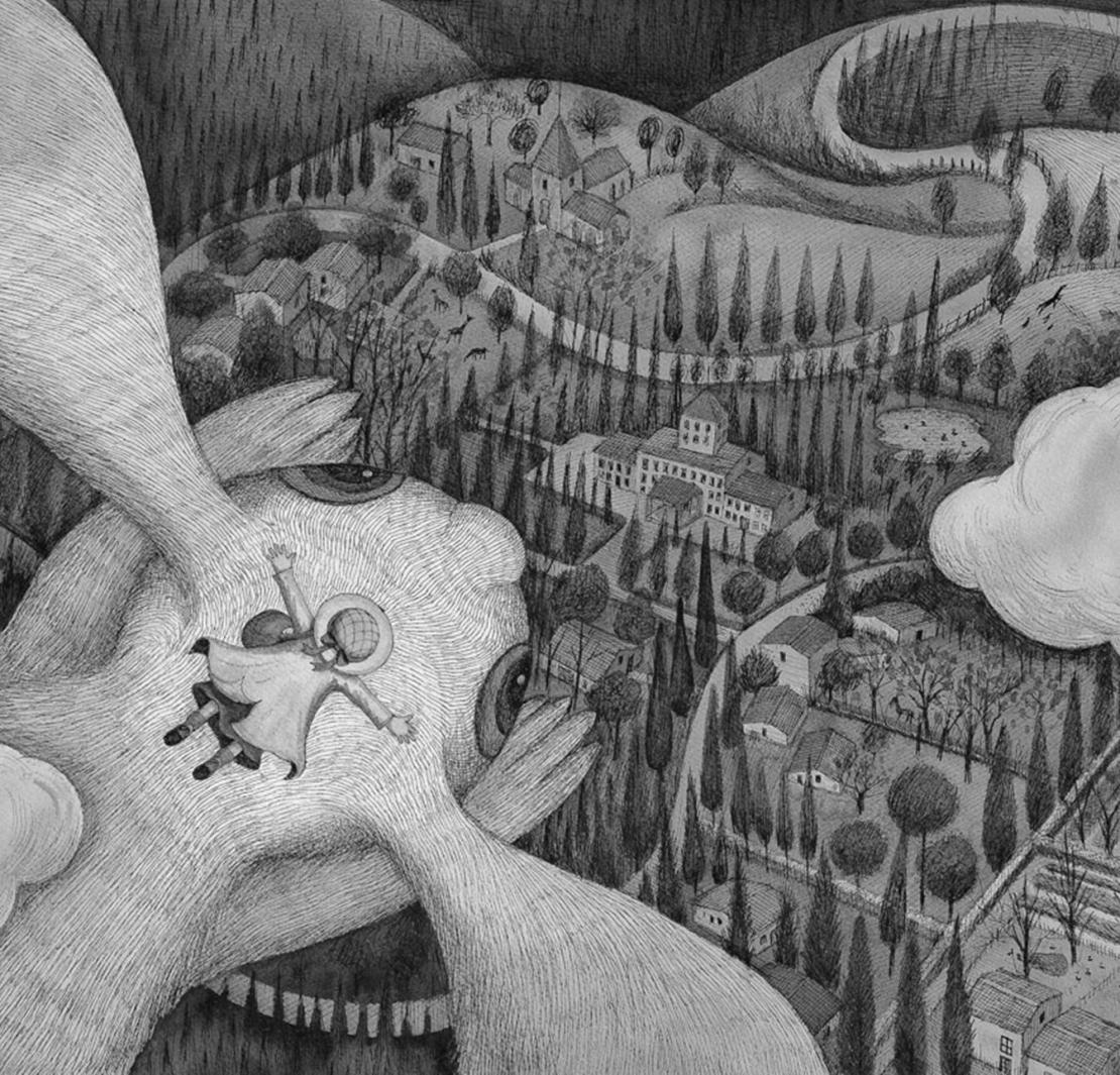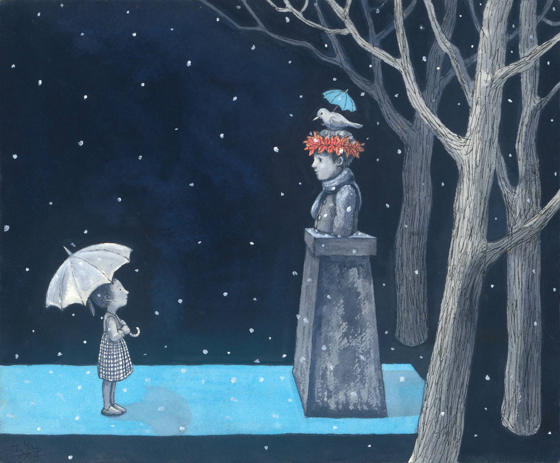 走進「幾米——畫室裡的呢喃」展覽現場,映入眼簾的是幾米新作《囈語呢喃》。此作與幾米2005年所創作的「謝謝你毛毛兔,這個下午真好玩」系列有著呼應關係,皆為藝術家將疫病傷逝轉化為詩意的動人敘事。前者為後疫情時代所作:作品中,原本嬌小的兔子在幾米筆下化身為隱身於樹叢中、頭戴鮮艷花朵的巨型動物,牠圓溜溜的雙眼中仿佛隱藏了許多秘密,為畫面注入了一股神秘而又柔軟的氛圍。而後者是其反思2003年非典型性肺炎(SARS)後所繪製的繪本,幾米用畫筆描述了瘟疫後的故事——瘟疫籠罩下,大家紛紛逃離了當初賴以生存的城市家園。昔日的女孩已成為老婦人,在荒廢的動物園裡再度於相逢,毛毛兔喚醒老婦人心中沉睡的小女孩,猶如經歷了一場迷人的甜夢。