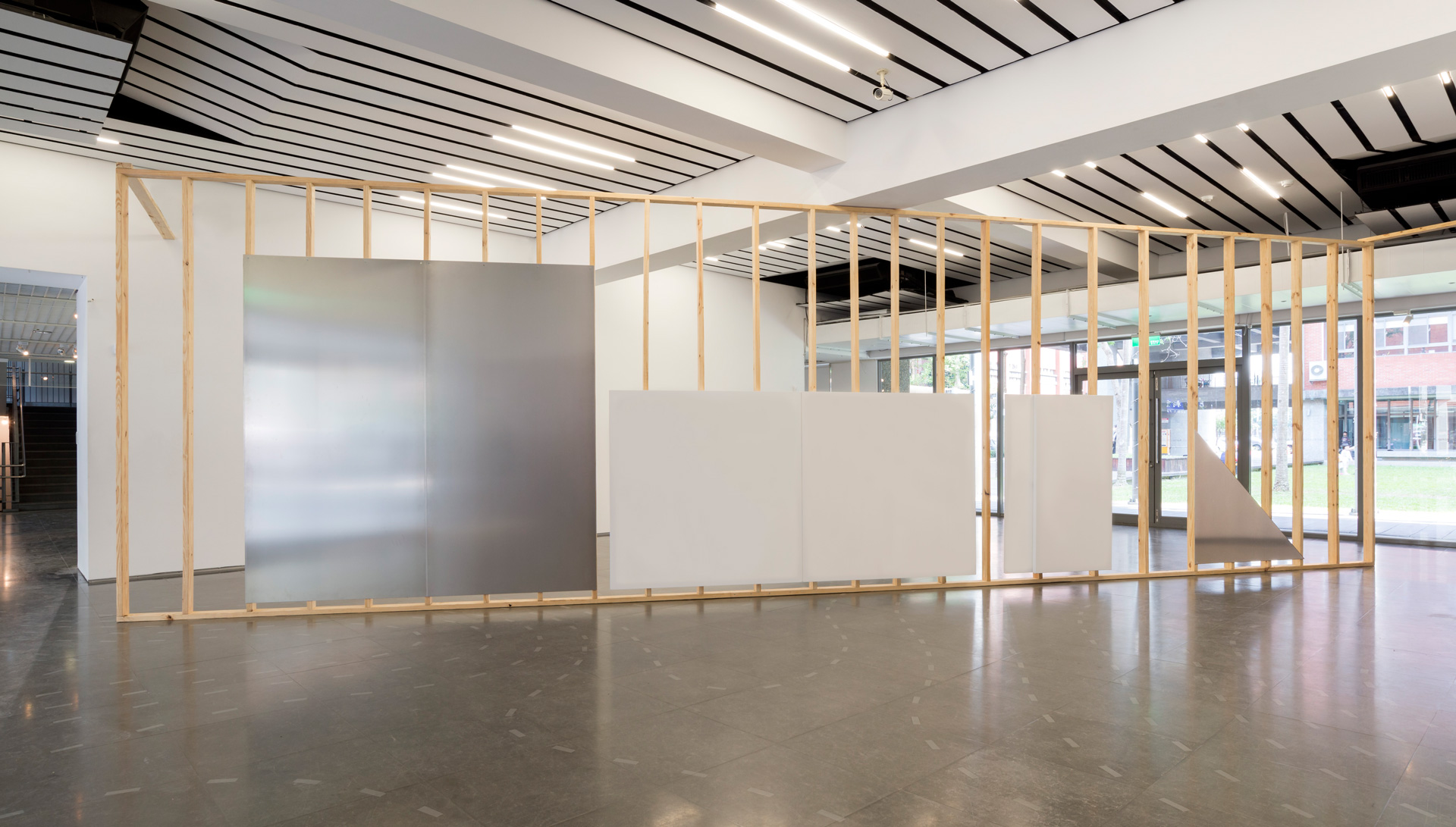 在展覽動線安排與展示間設計上,同時是策展人也是展出藝術家林明弘,在觀察林壽宇的畫作時,注意到在這時代的藝術家,他們專注思考的問題物不再僅僅停留在作品本身,反而是放大至物件在展牆展示的過程,作品與建築、空間產生的關係,因此在展覽設計中,大部分的作品皆為展示在為展覽特別設計的板座、展牆中。而林壽宇《「左」或「右」》在此次的展覽中,林明弘特別將畫作從畫框中解放出來。