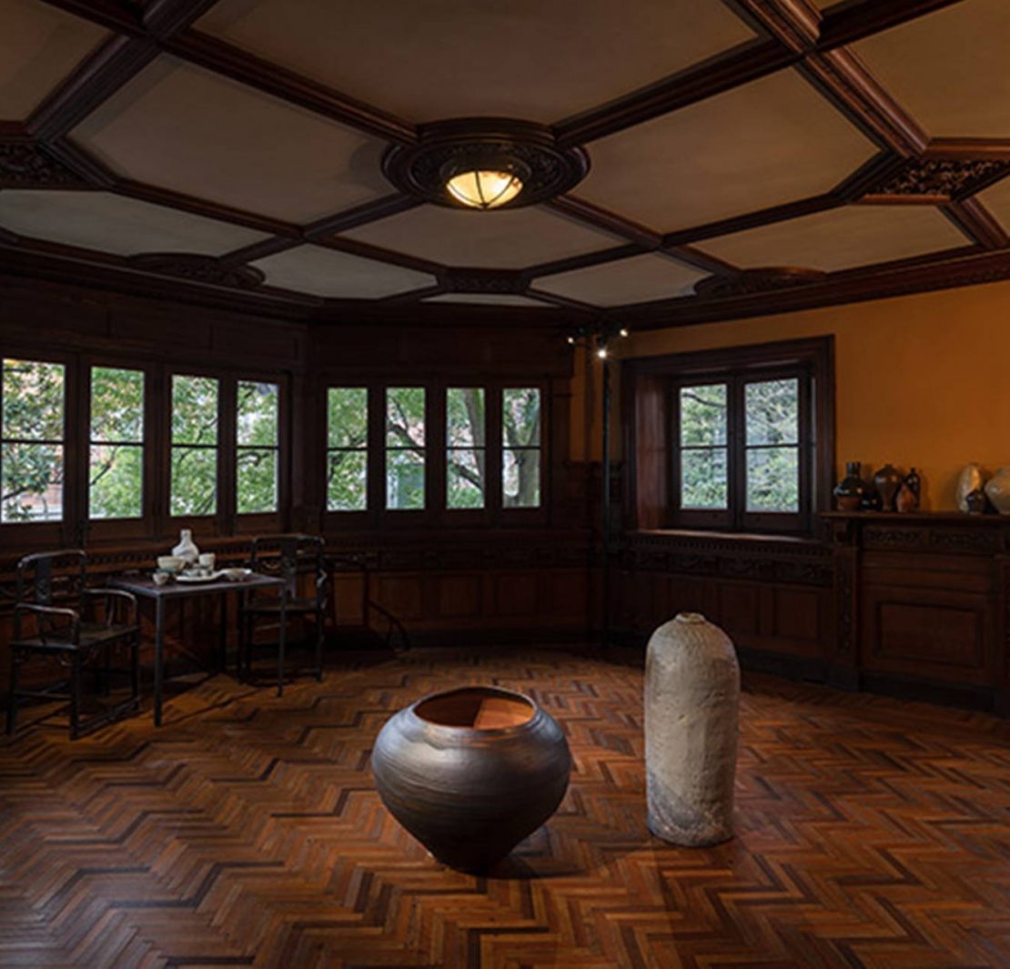 隨後來到二樓層的榮夫人臥房,蓋茲展出了自身藝術實踐中的關鍵媒材:陶瓷。這時的他已經化身幽影與建築空間進行對話者,除了兩件藝術家在芝加哥柴窯內製作的名為《瘦削》(Skinny)和《巧克力》(Chocolate)的大型器皿矗立廳中央外,一組明代桌椅和充滿中式風格的瓷器作品錯落擺放在空間中,將榮夫人房間化身為一家中國瓷器店的一角。