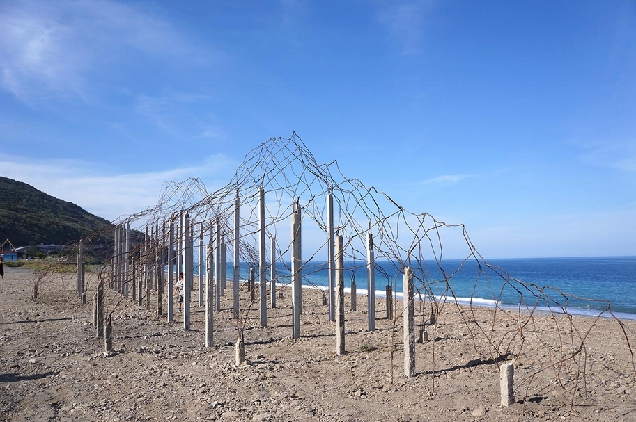 上述這種由地景延伸的創作方式,也呈現於游文富位在南田建地的竹編裝置《南方向量》。這片緊鄰堤防的作品由海灘往陸地方向延伸,與當地居民合作、以竹編出海浪、沙灘甚至山丘般的波紋造型,而本次作品所用的竹材也因應台東「九個太陽」的烈日環境進行特殊處理,在陽光的照射下,竹面的反光也如粼粼波光,在這片閒置的空地上連結土地與海洋的關係。由南田部落沿著海岸線往北前進,大武濱海公園海灘上一座彷彿被人遺落的《陽台》則是邱承宏的立體雕塑作品,這座「陽台」材料以會隨著展期時間逐漸變白的美國檜木構成,在藝術家的想像中,這件作品最好的呈現狀態是讓它在岸邊隨著潮汐自然漂移。在現實生活中,「陽台」本身即是某種交接於公領域及私領域之間的介面,而這種對於空間、現場與公眾領域縫隙中的反覆思考,似乎也直接回應了此次策展概念中企圖討論的某種公眾性意義。
