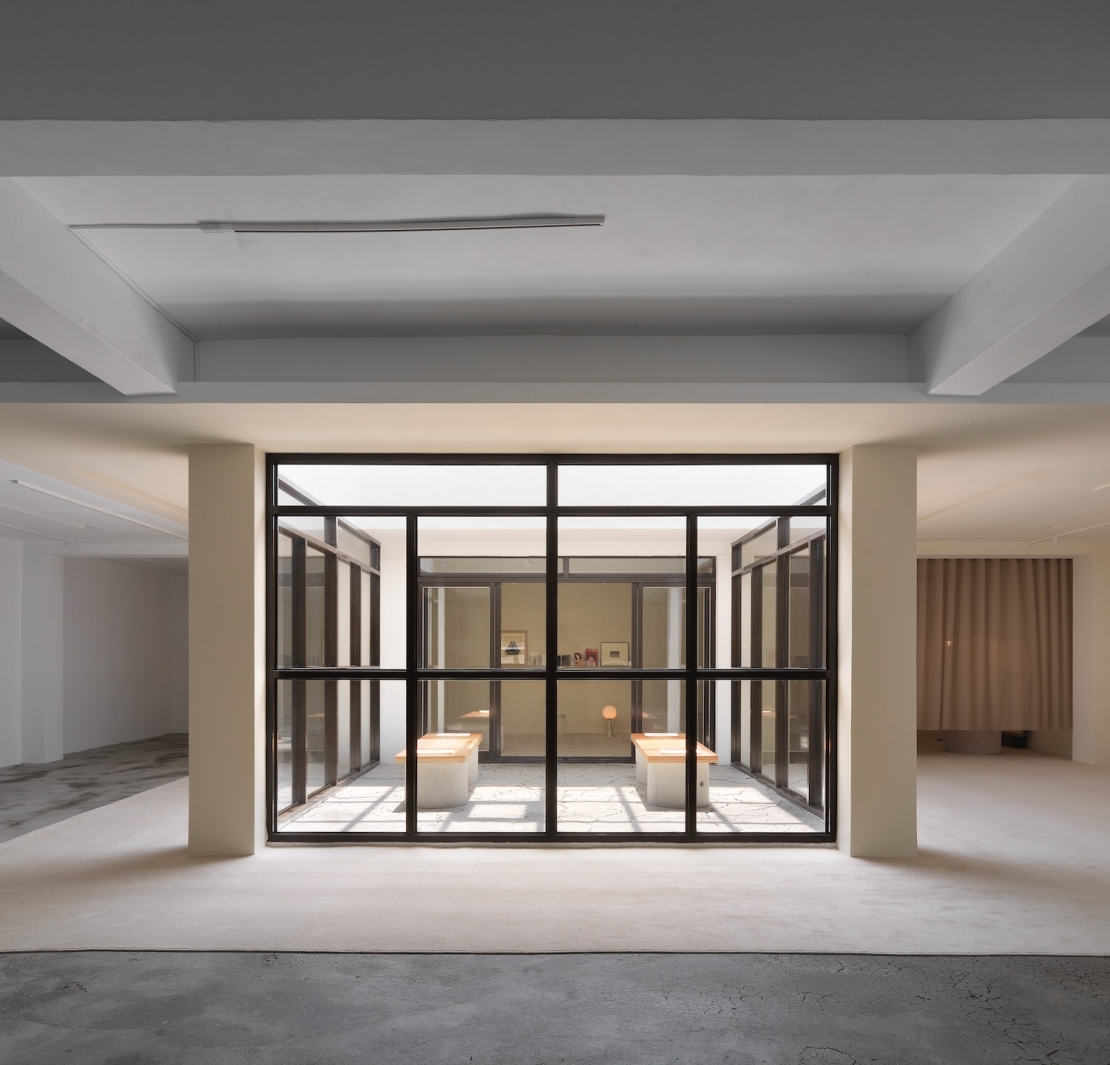 作為一檔好客的展覽,「家物事」在九單一隅設置了作為接待空間的客廳。換上室內拖鞋踏進展間,可以看見四件有章的典藏品,以及參展藝術家的參考文獻與舊作。客廳中心的天井與接待處的大廳,則各自放著一本策展人與文史工作者合作、悉心編纂的浮洲當地文獻。