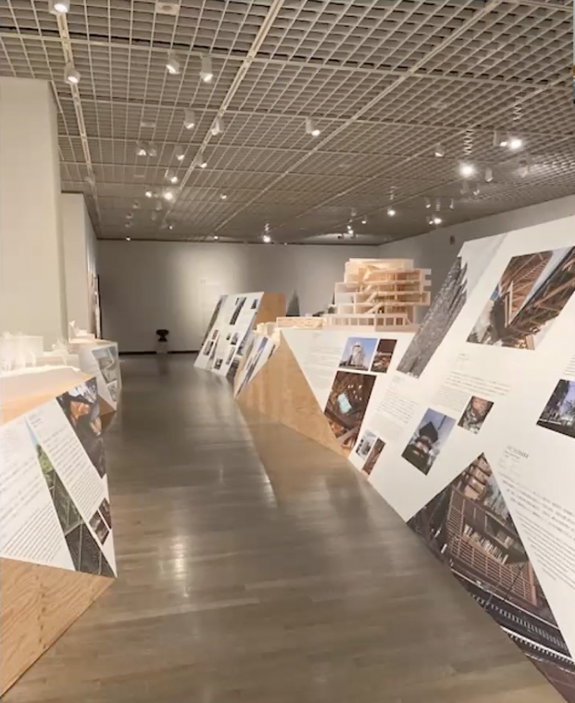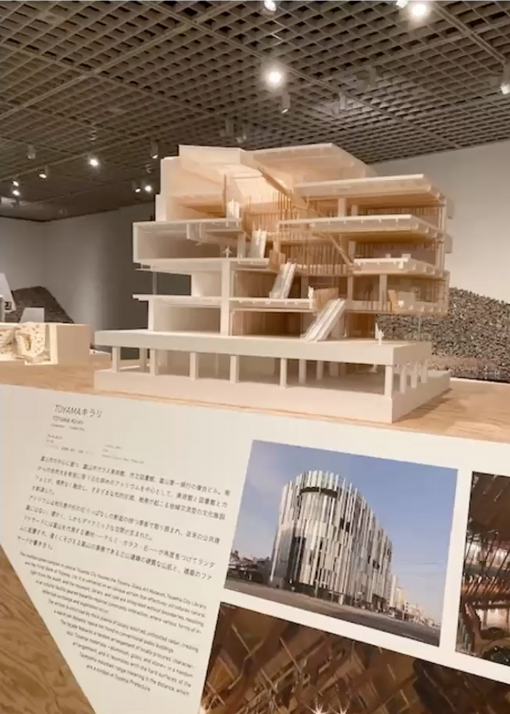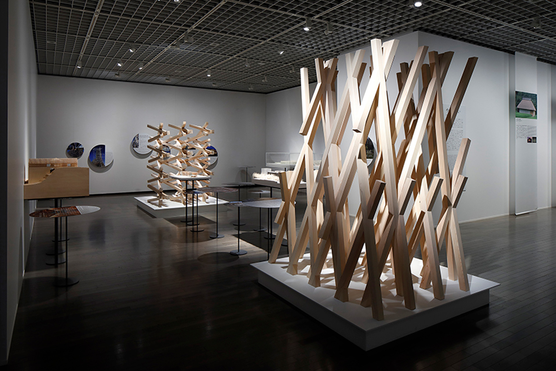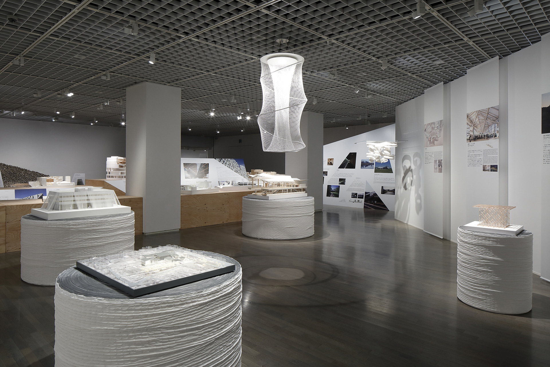 為了具體說明,展覽中直接將九州福岡太宰府天滿宮星巴克的等大模型搬來現場,與觀賞者比高。透過僅由六公分長寬的木材交錯排列模型,或許可以揣想進入咖啡廳時,宛如森林般的幾何學旋律,柔軟而看不見盡頭。另一個作品《雲上的圖書館》,位在在高知與愛媛縣界之間,被譽為「雲上街道」的檮原。複合型設施裡兼含體育館、幼稚園、社會中心,親切地歡迎小孩與老人們紛紛脫鞋進入圖書館,感受衫木地板的縝密紮實,多樣工作坊活動也使空間轉化為,同家一般的跨時代對話場域。