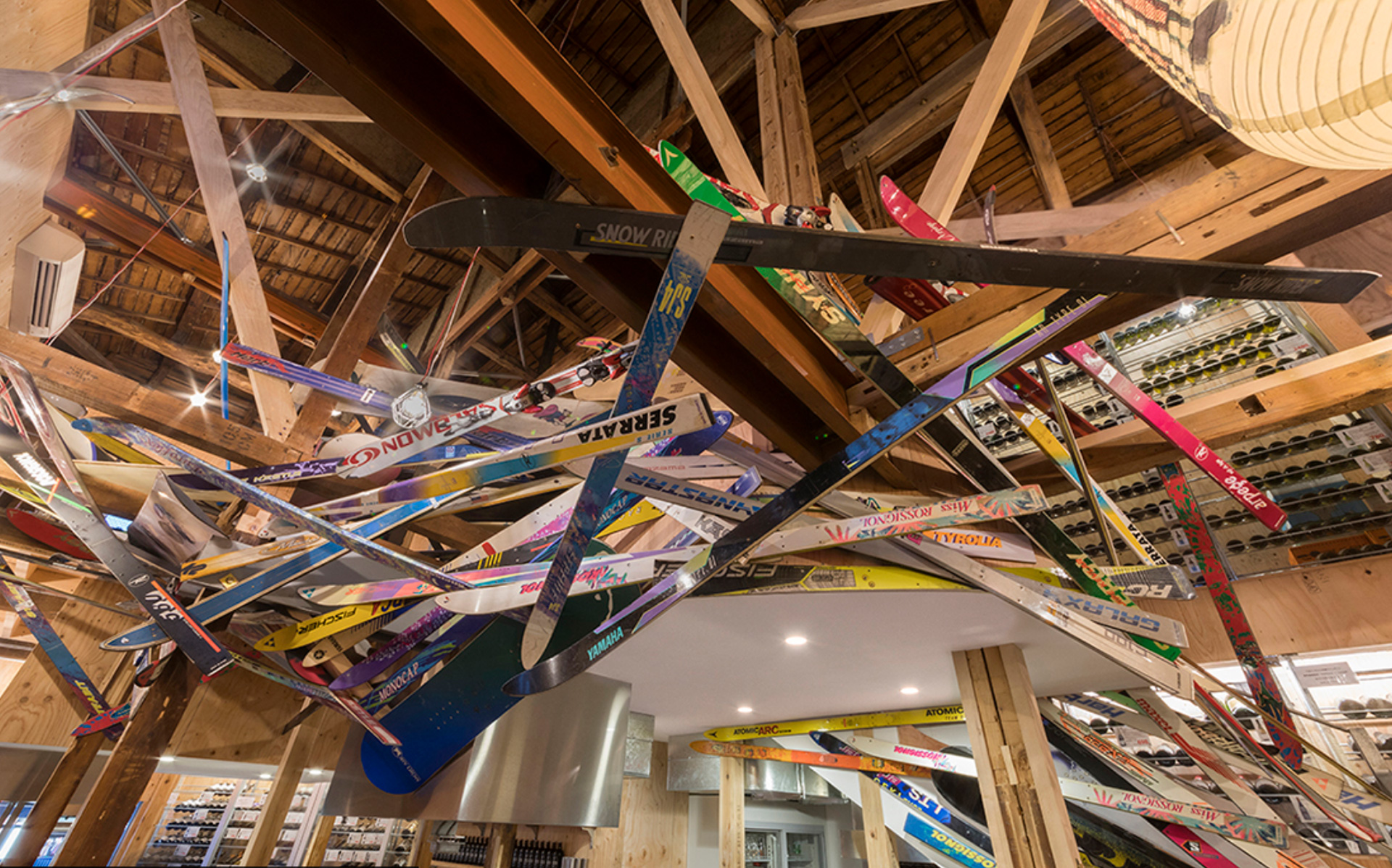 關於「時間」的其中一個例子為,東京下北澤的《てっちゃん》。這間由廢棄房屋蓋造的串燒店是非常受當地人喜愛的聚餐場所。店外將既存的鋁架隨機排列,使昭和風的老屋多一層經濟卻摩登的氛圍。去除之前的木架構造,大量運用既有滑板、滑雪板,拼造成收銀台與階梯,獨具個性。