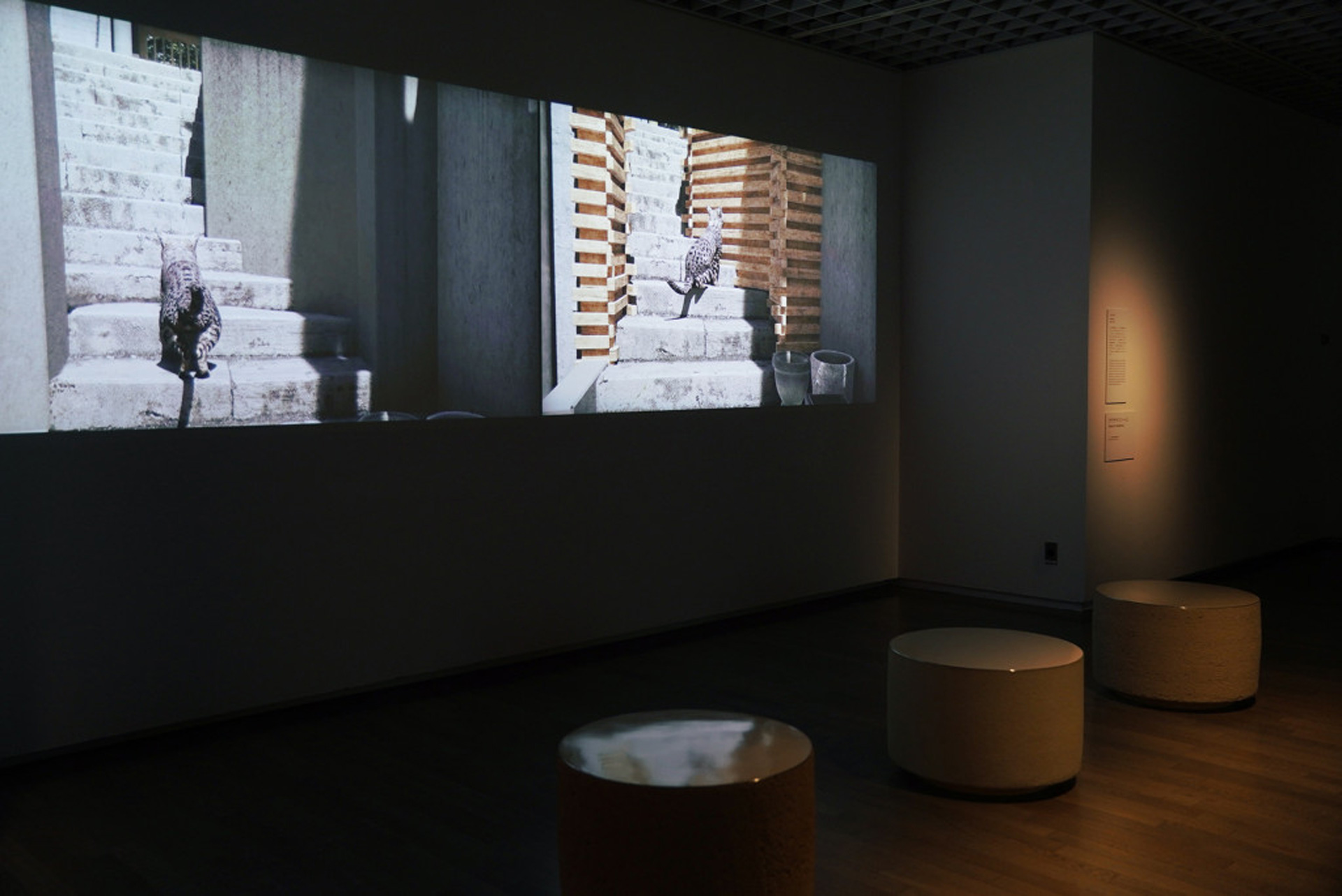 以前喜歡躲在隈研吾的建築裡,沉浸在木材視覺與觸覺暖度,以及表面排列的數大為美,然而在展覽之中,可以發現更多人類依存的環境元素為何,更牽連到了遠古、甚至是人類演化中,與貓相似的生活習慣。去除掉太喧囂的室內裝潢與照明後,設計新型公共空間之貓的五大原則:孔洞、粒子、柔軟、斜面、時間,重新審視了後疫情時代自我與外部的關係,以及安全感、舒適的定義。從作品可以發現,凡粗糙、細微、古老、脆弱的物體突然都變得重要,亦如身為人的不完美。正因為褪去了完美的包袱而自由如貓,然後人才得以與空間對話。
