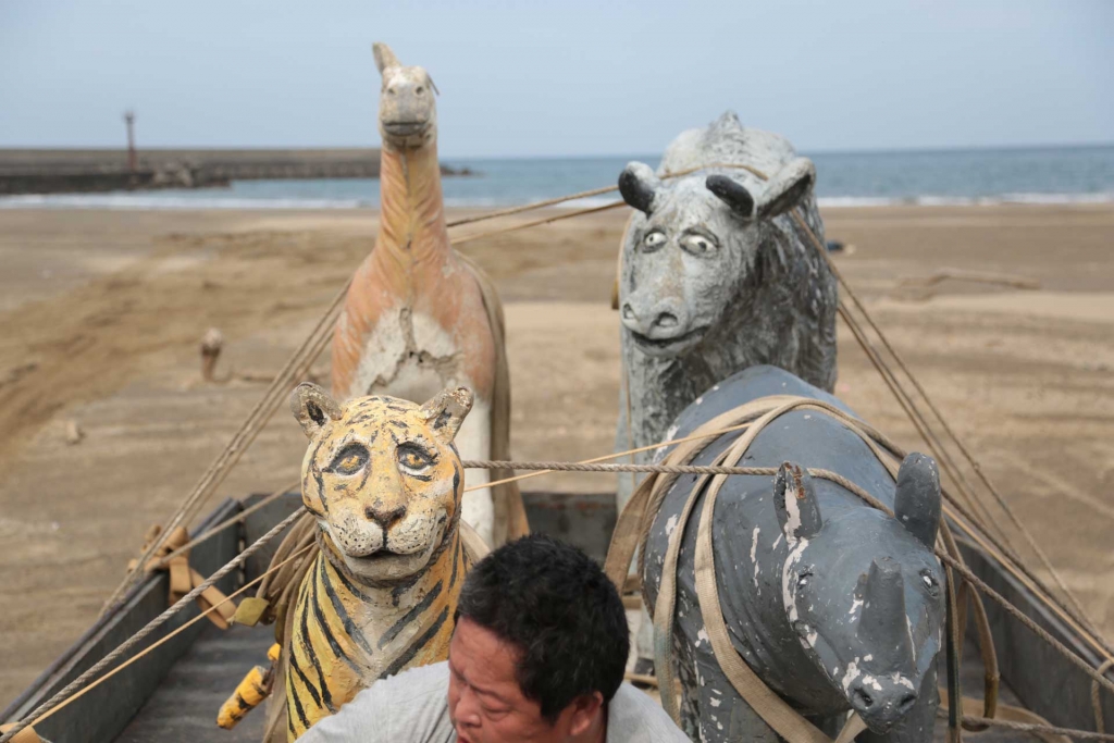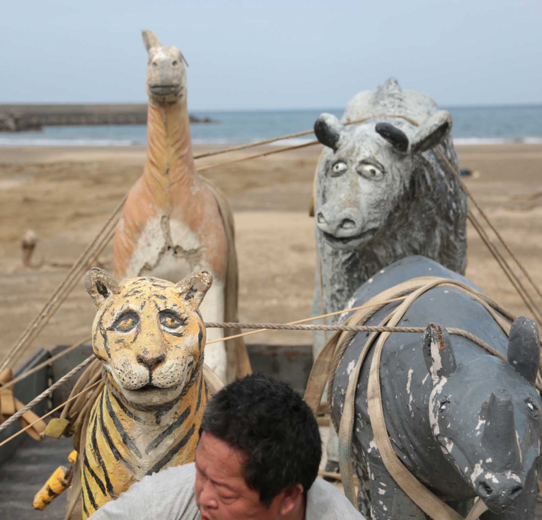 藝術家邱承宏發表於2020年「屏東落山風藝術節」,並在今(2021)年9月移師於花蓮海是生活節「當你看了一個海浪」展覽中的作品《水泥動物園》中,置於海濱的各式動物裝置,原為1970與1980年代在台灣校園或公共遊樂空間隨處可見的水泥動物塑像。如藝術家的創作理念所言,這些雕像並非由專業的雕塑藝術家所創作,而是來自於一般的民間水泥匠師,相較於斟酌解剖學理的古典雕塑,通常帶著樸拙且滑稽的造型。隨著時代演進,它們被各種新式的塑膠材質大型遊樂器材與模組化的造型技術取代,而漸漸地消失於台灣的校園與公共空間當中。而邱承宏的《水泥動物園》創作行動,則重新尋回這些被棄置的水泥動物塑像,並重現於屏東與花蓮的海濱,在感受到雕塑與環境交織出的奇幻氛圍之餘,其實也令我想到了以前唸國小時,在同學間所流傳的這段故事: