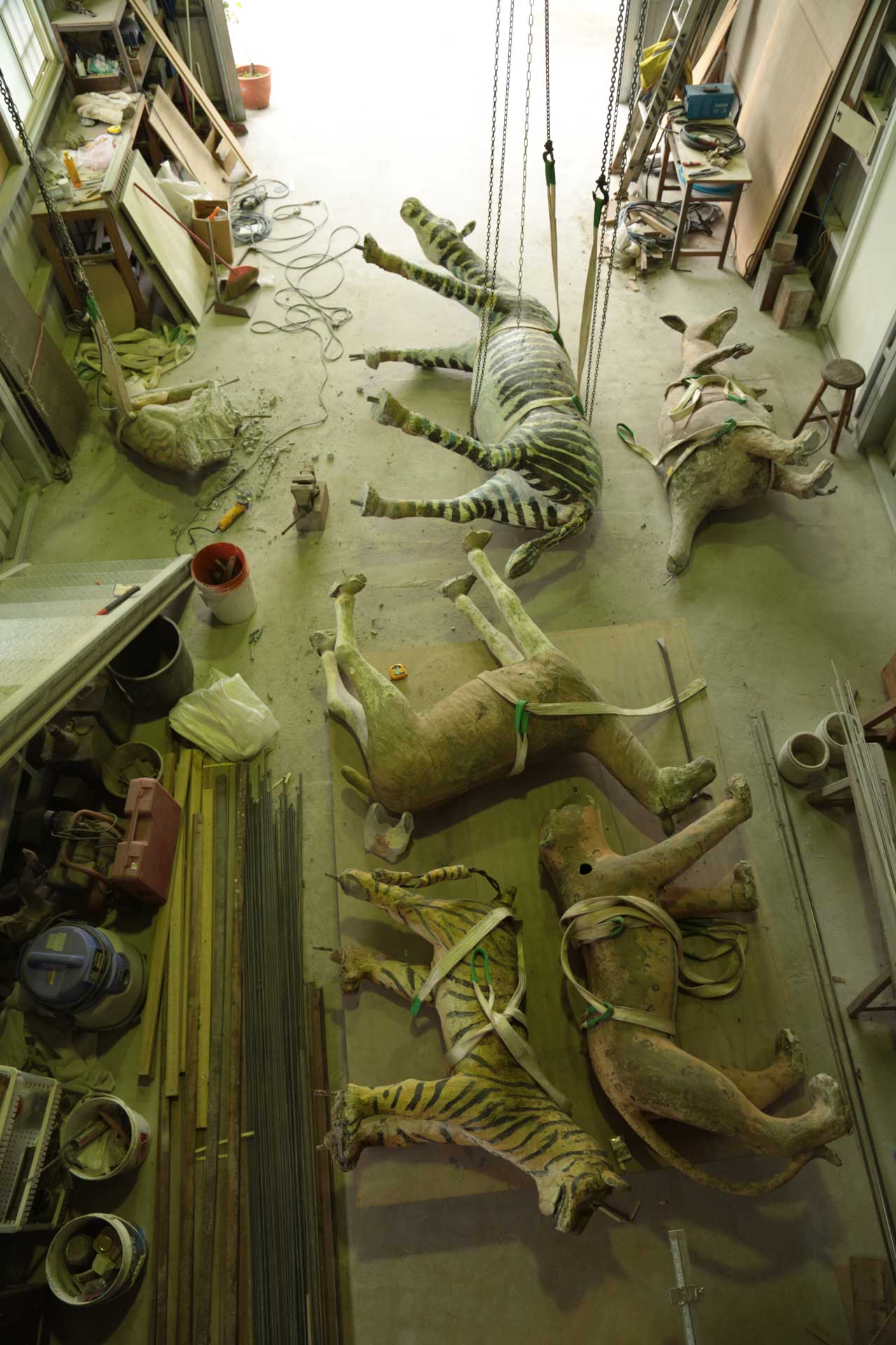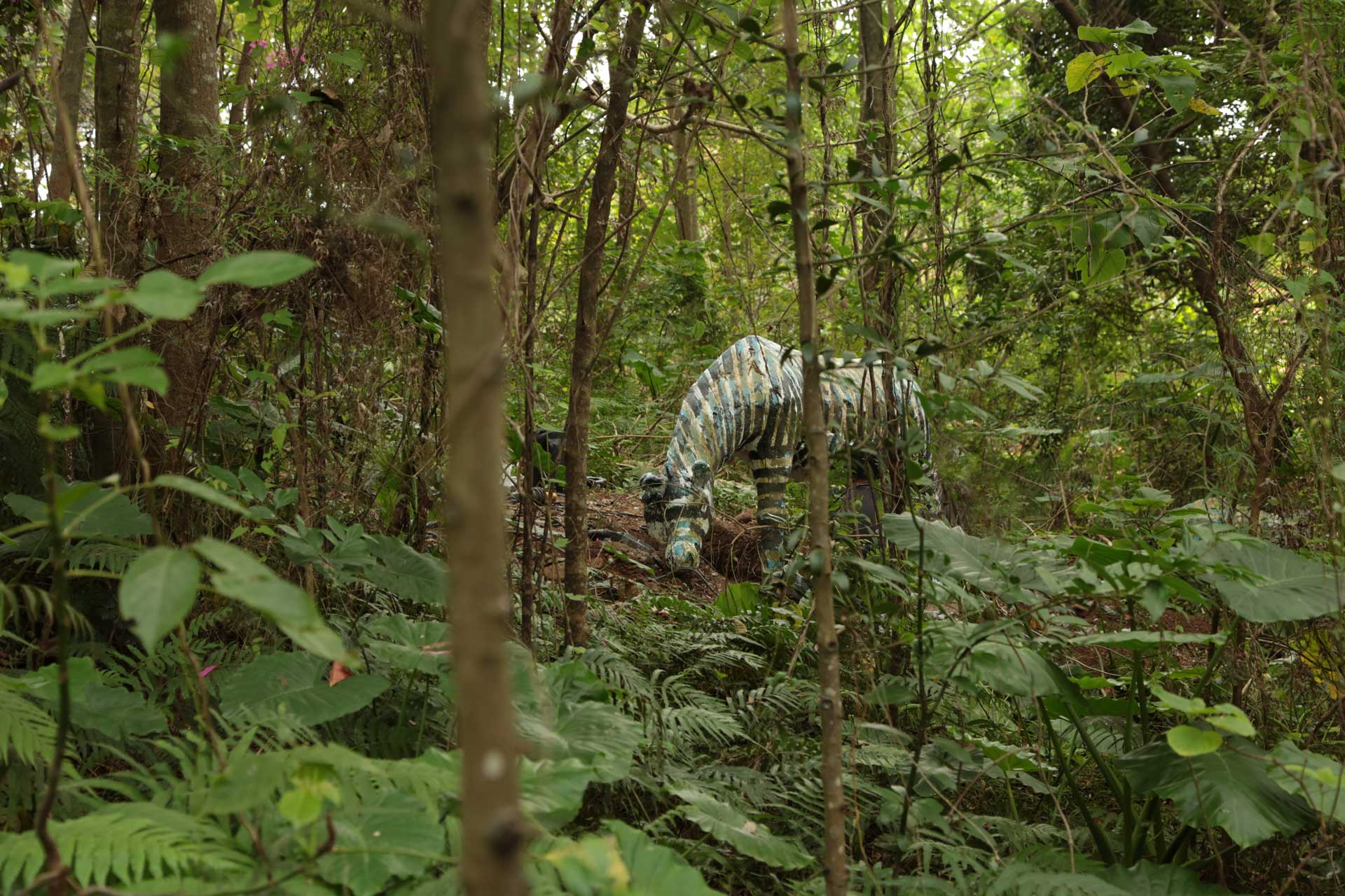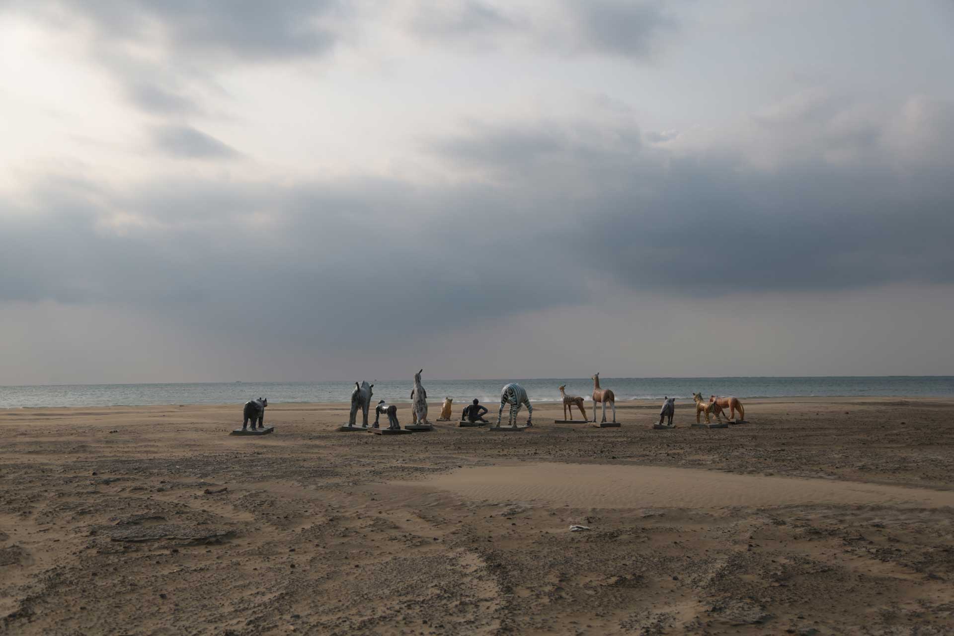 如今,邱承宏作品《水泥動物園》的出現,則是勾起了我腦中這段幾乎快要被忘掉的往事,這個過去的校園怪談,彷彿以不同的形式重現在我的眼前。在藝術家的創作過程中,他將隱沒於花蓮美崙山中的水泥動物重新挖掘出來,並多將展場選於海濱一帶,這時原本幾乎被廢棄於山野的動物們,在海天交界的廣闊環境當中重置,彷彿重新被賦予了更寬廣的生命想像。換個角度來看,在藝術家這突兀甚至近似於奇幻的場景安排下,在暗黑的深夜時分,是否又會開始有新的故事,呼應過去1990年代校園的恐怖記憶,在作品裝設的位置流竄呢?謠言與傳說再起的當下,相信就是這些水泥動物重新復活的時刻。