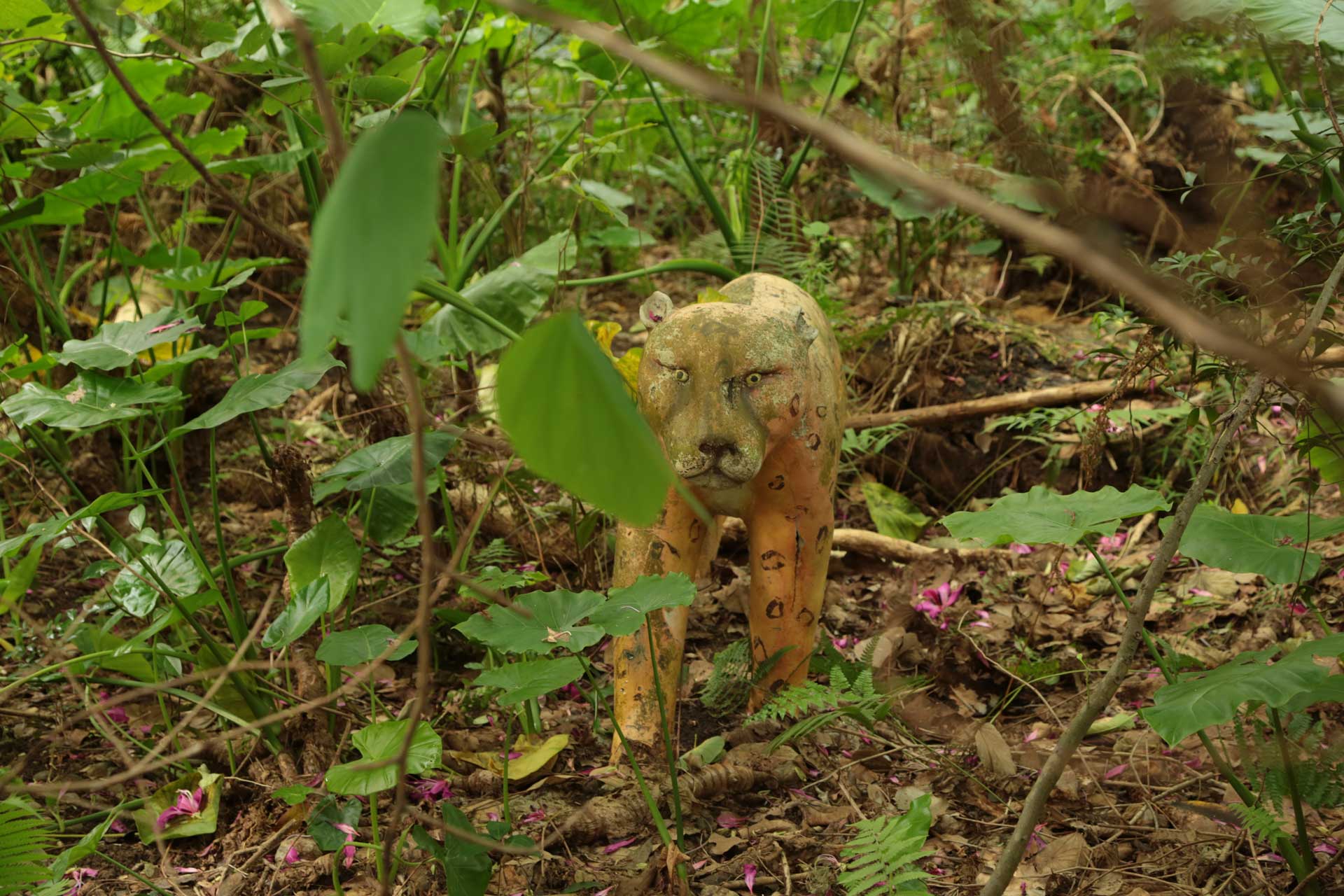 如果我沒記錯,從教材園的入口一走進去,就可以看到一隻豹對我張著血盆大口,後面再有一隻獅子在左斜方的角度正襟危坐地立坐著,走到豹的水泥像定點時,獅子的眼睛就直接對著我,再往旁邊一瞄,犀牛、長頸鹿、駱駝散落各處,但都對著同一個以豹為中心的視點,令我覺得自己的一舉一動都受到監視。豹的附近有一個水龍頭,上面掛著一條長長的水管,再往天空一看,就會看到一片漫天的樹枝開了一個洞,正巧就是校外的人行天橋,也就是說從天橋的某個定點,可以看到教材園的內部。