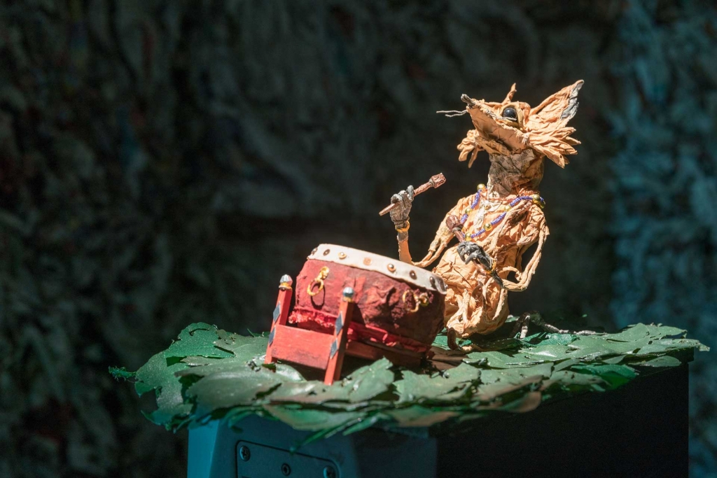 看似簡單的情節,但在觀看《流動碎片》時,卻又發現事情並不那麼單純:隨著故事進展,鼠鹿形象不時變化,時而老鼠、時而狐狸,甚至是穿戴著藝陣般道具服裝的人臉。影片中起舞奏樂的動物陣仗,也和原始文本並無直接相關,而是令人想起藝術家作品中反覆迴響的台灣醒獅與印尼甘美朗音樂元素。直到看見在片頭與片尾出現的鏡面,觀眾這才恍然大悟,這不單只是民間故事的紙紮動畫版,也是一段關於鏡像本身的歷程。在交錯的剪接之間,反射出的是不同文化間的相似傳說、不同物種間的故事想像,也是藝術家不同創作歷程的回顧。此處上演的是一則文本互涉的流動影像故事,等待不同文化背景的觀眾前往解讀。