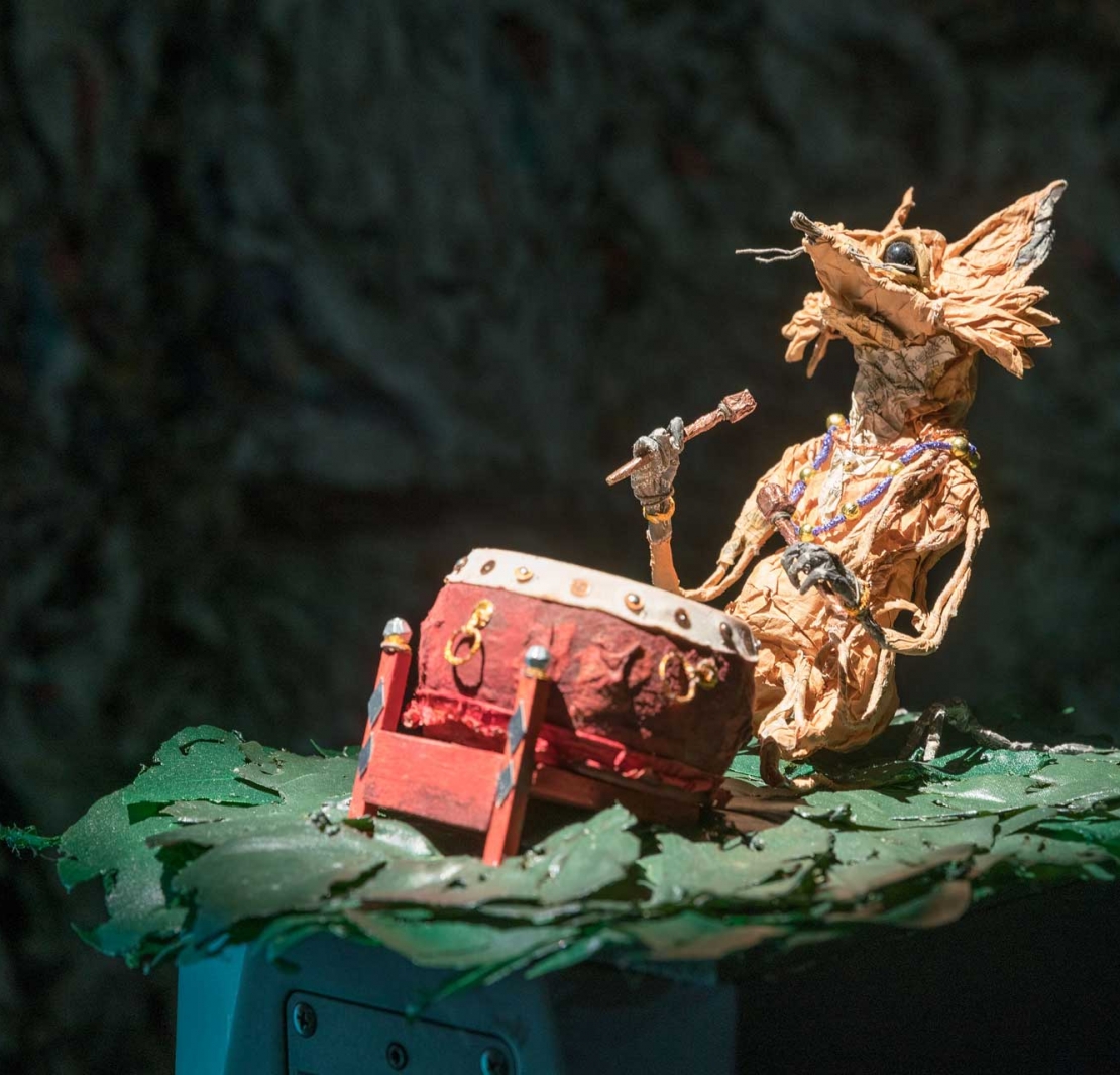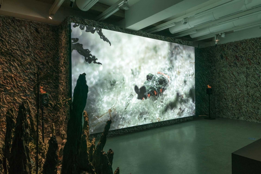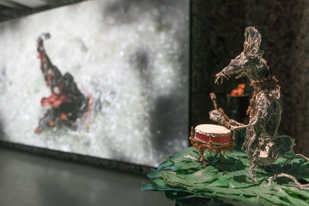 一推開《動物故事系列:流動碎片》(暫譯,原名Animal Story Series: A Flowing Piece of Shard)展間入口的厚重簾幕,觀眾便瞬間從明亮的柏林民眾宮殿(PalaisPopulaire, Berlin)展場,跨入了另一座既陌生又令人著迷的魔幻世界:黑色牆面上覆蓋著密密麻麻的德文與中文報紙紙紮,造型奇特的動物雕塑彷彿正進行某種神秘儀式,節奏強勁的鼓聲震盪著整座幽暗空間;而在大型屏幕上,放送的是一幕幕讓人目不轉睛的精緻定格動畫。一時間,觀眾忘卻了自己正身處於《2021年度藝術家》( “Artists of the Year” 2021)的展場之一,轉而思索著:這裡述說的究竟是怎樣脈絡下的故事?