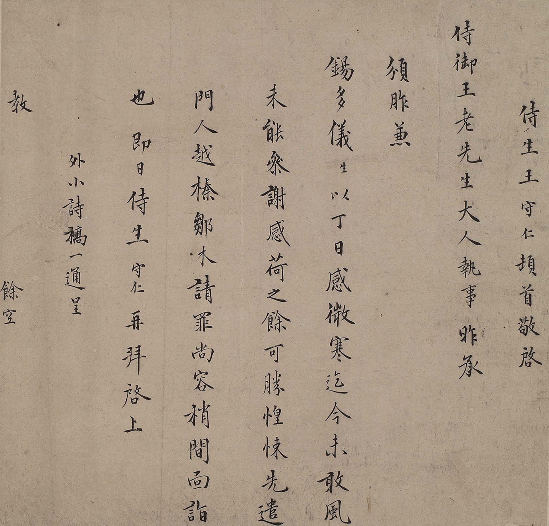中國自古是東亞重要的文化輸出國,上至士大夫治學理念,下至常民的價值觀,從宗教到藝術,中國對日本的影響比比皆是。從儒學談起,在明代盛行的陽明心學遠傳日本,一步步發展,在德川幕府晚期成為顯學。陽明學說不但為幕府武士奉行,許多明治維新的要角,如福澤諭吉、伊藤博文,亦是陽明學說的信徒,王陽明可謂影響中日的重要思想家。本次展出之王陽明手蹟〈與王濟書〉致長輩王濟,提及他因傷風未能參與分賜祭肉的儀式,遣門人代為請罪。王陽明傳世書法以豪放的行草書為多,本件是較為少見的恭謹之作。