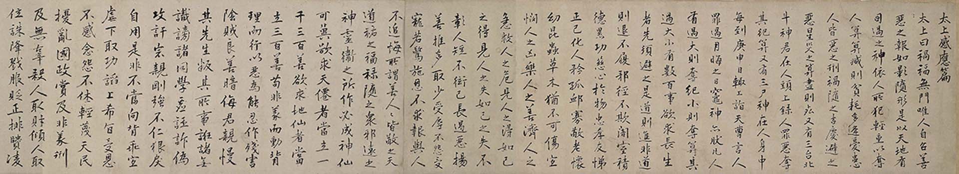 陽明心學太難解?論作人處事之道,「善有善報,惡有惡報」的道理想必更容易讓大眾理解遵循。晚明進士袁了凡,69歲時將一生經歷所感著為《陰騭錄》,又名《了凡四訓》,主張行善可改變命運、突破宿命,是影響力極廣的勸善書。此作很早東傳日本,不斷翻刻,又翻譯為和語,流傳廣泛,影響了日本大眾的道德意識,被稱為「帶來幸福之書」。《了凡四訓》中善惡果報的觀念,深受宋代善書《太上感應篇》影響。這次首度公開展覽的袁了凡〈太上感應篇卷〉為其53歲所書,可見袁了凡中年時的學養,「禍福無門,惟人自召;善惡之報,如影隨形。」與晚年著成的《了凡四訓》遙相呼應。