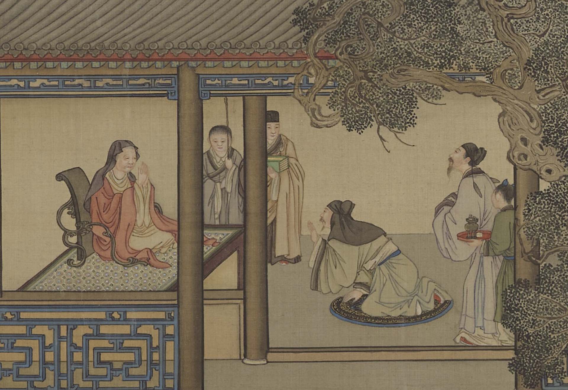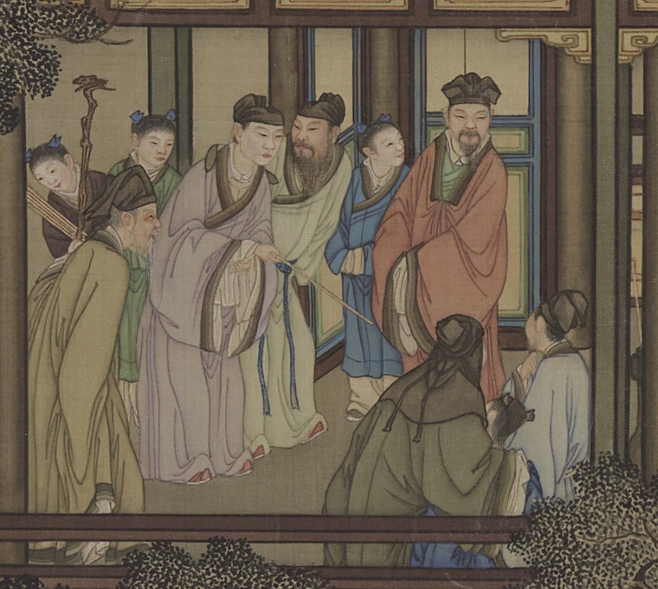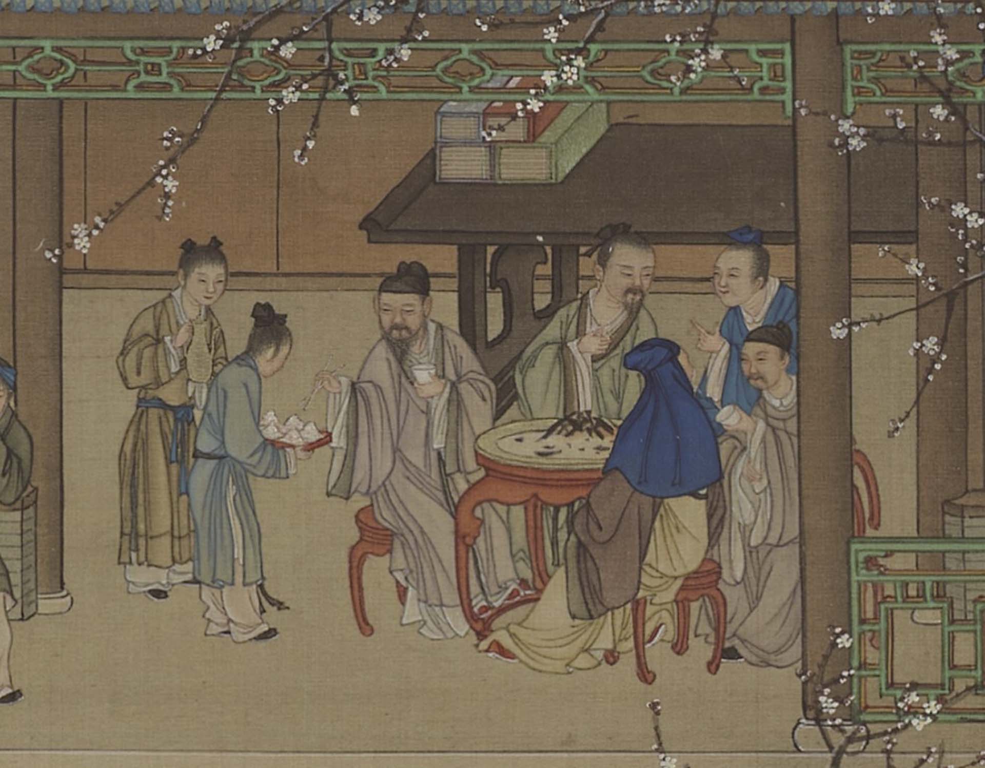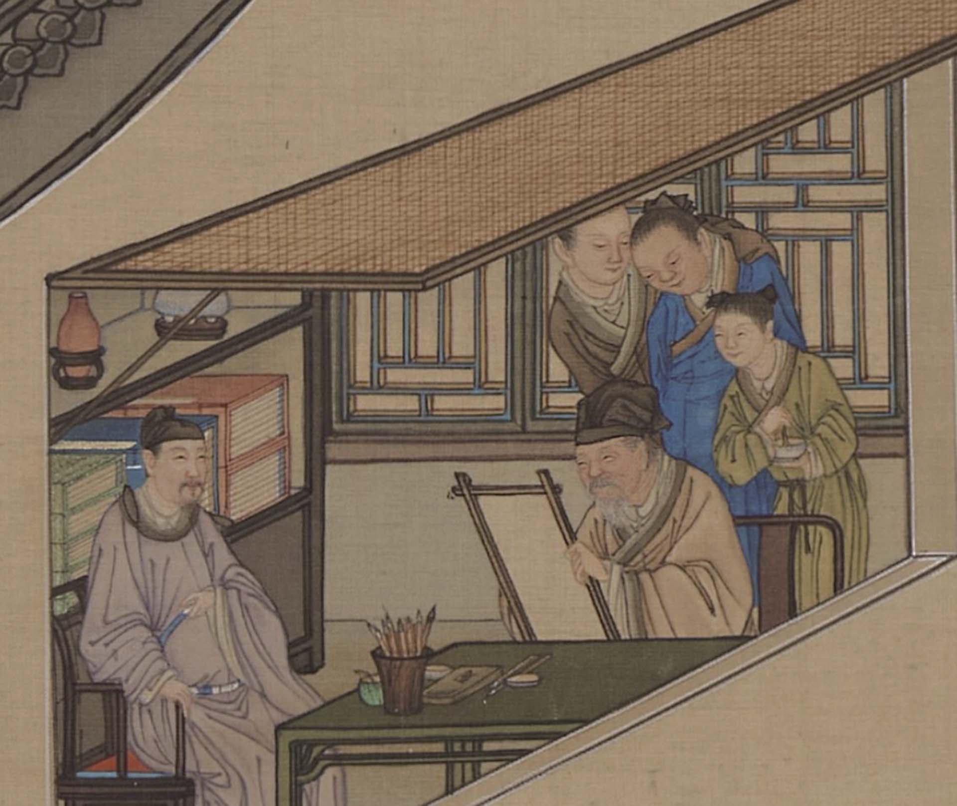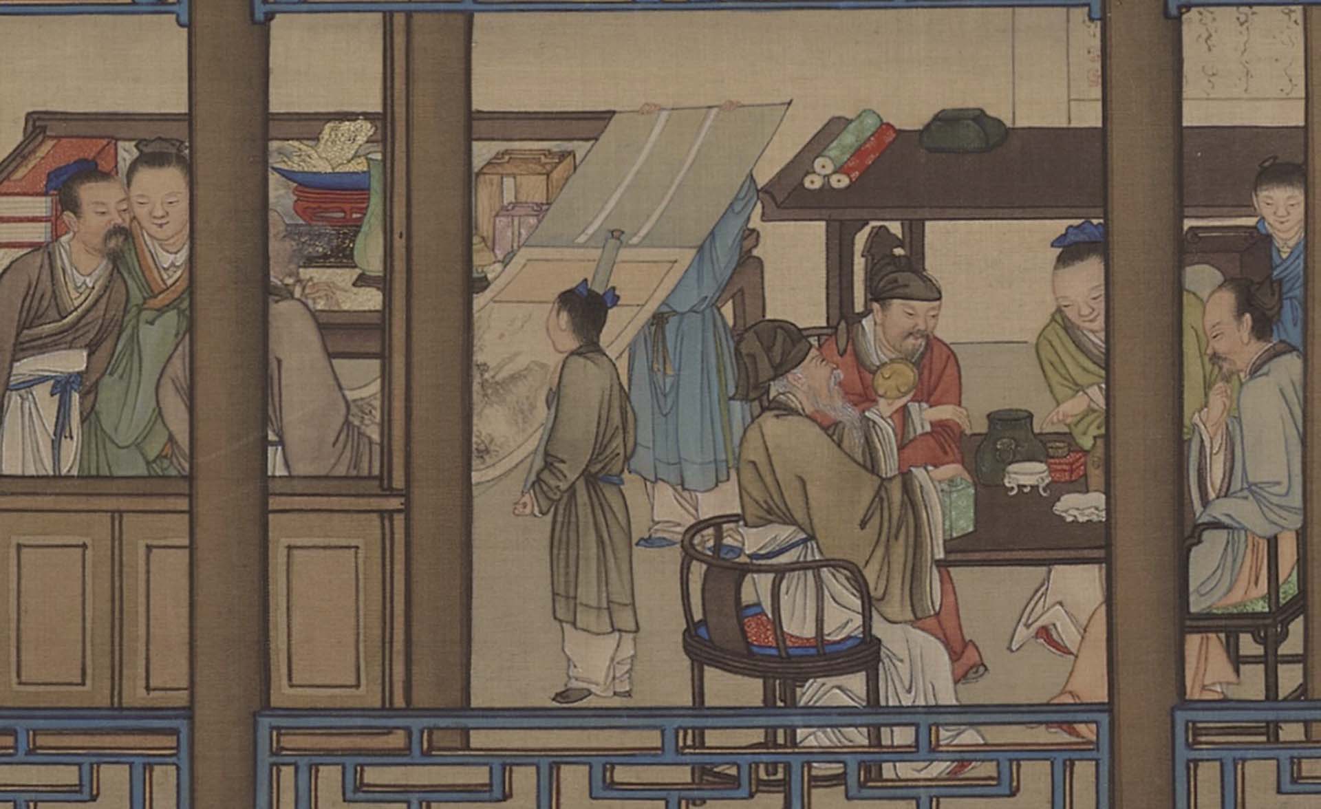 以這次展出的三件畫軸內容為例,各自安排了豐富的活動。「十月」景中右側鑑古的廳堂裡,畫家讓文士們賞玩卷軸名畫,鑑定古器彝鼎;左側建築引進充足光線的大窗裡,老畫師正替士人畫像;遠處樓閣中,婦女彈奏樂器、縫製衣物,或對坐談天。