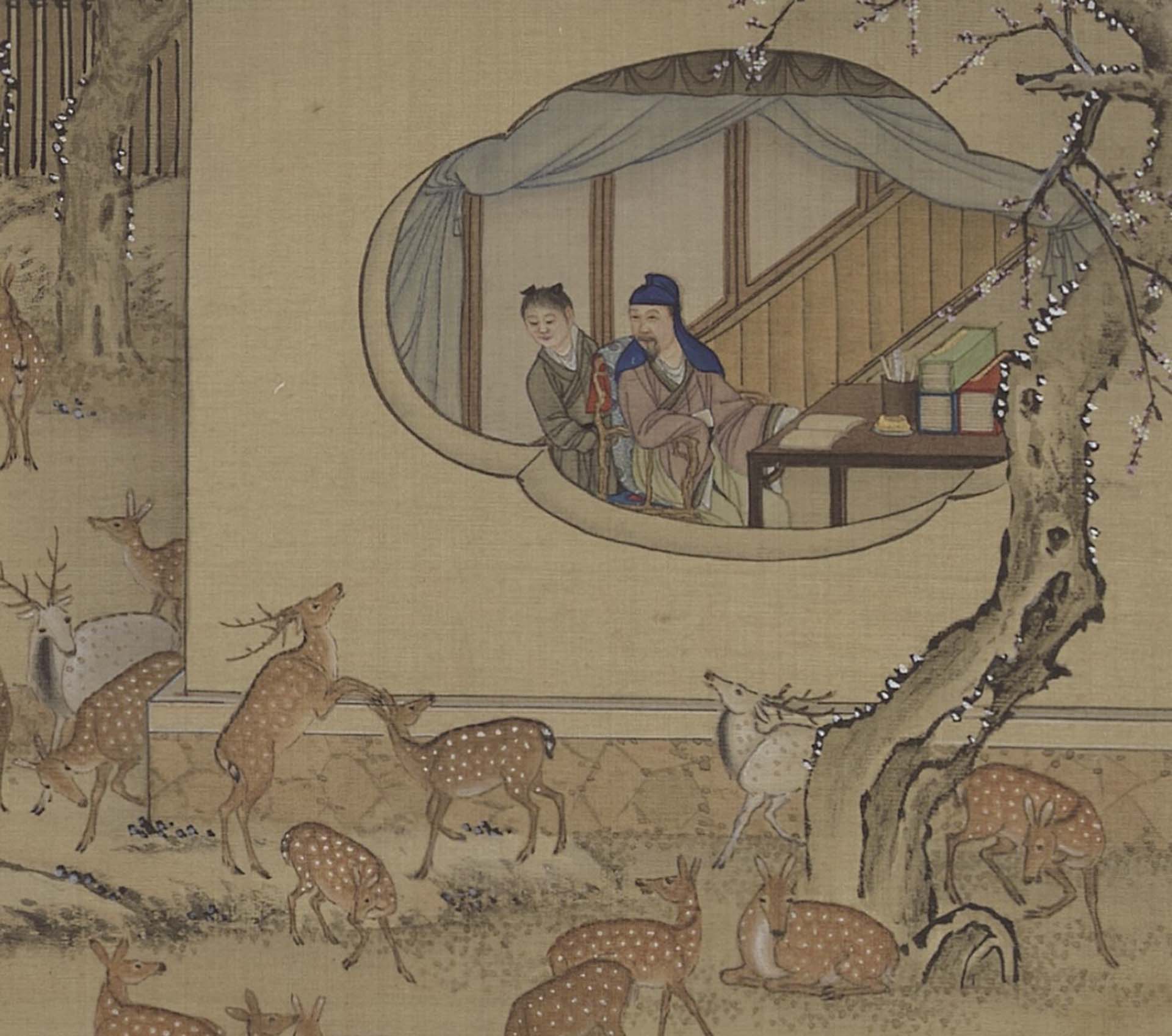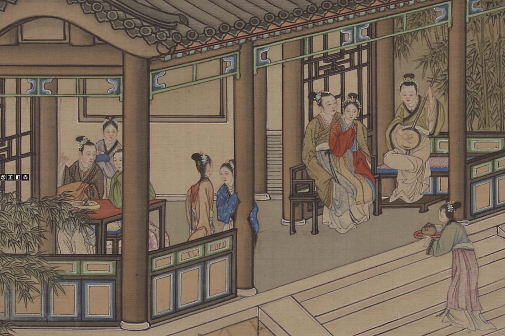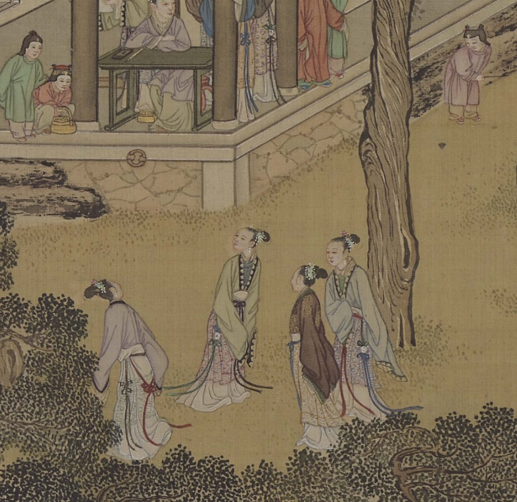 可以想像月令圖的畫家創繪之際,將各個月份種種不同的活動配入場景時,也可能會因為活動調整廳堂樓閣的大小,以便更妥善地表現活動細節。比起吳彬的《歲華紀勝》,《畫院畫十二月月令圖》描繪的活動更細膩多樣。可以感覺到畫家在選擇每個月活動時,也盡力囊括各種能呈現該月份節慶與情調的圖像。不過,這些選擇不是無邊際的,主要還是限縮在能夠配得上華麗奇巧皇室園林舞臺的文雅活動。類似描繪各個時節農桑活動的《耕織圖》一類的庶民勞動形象,就不會是這類作為「宮廷版」家居生活指南的月令圖中的主角。