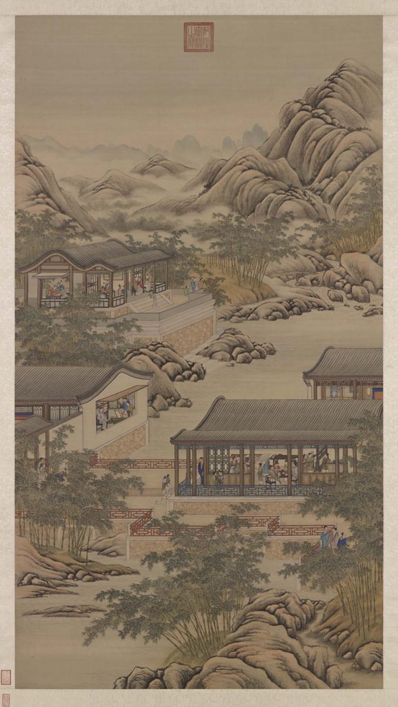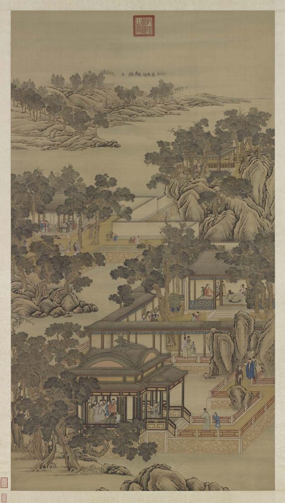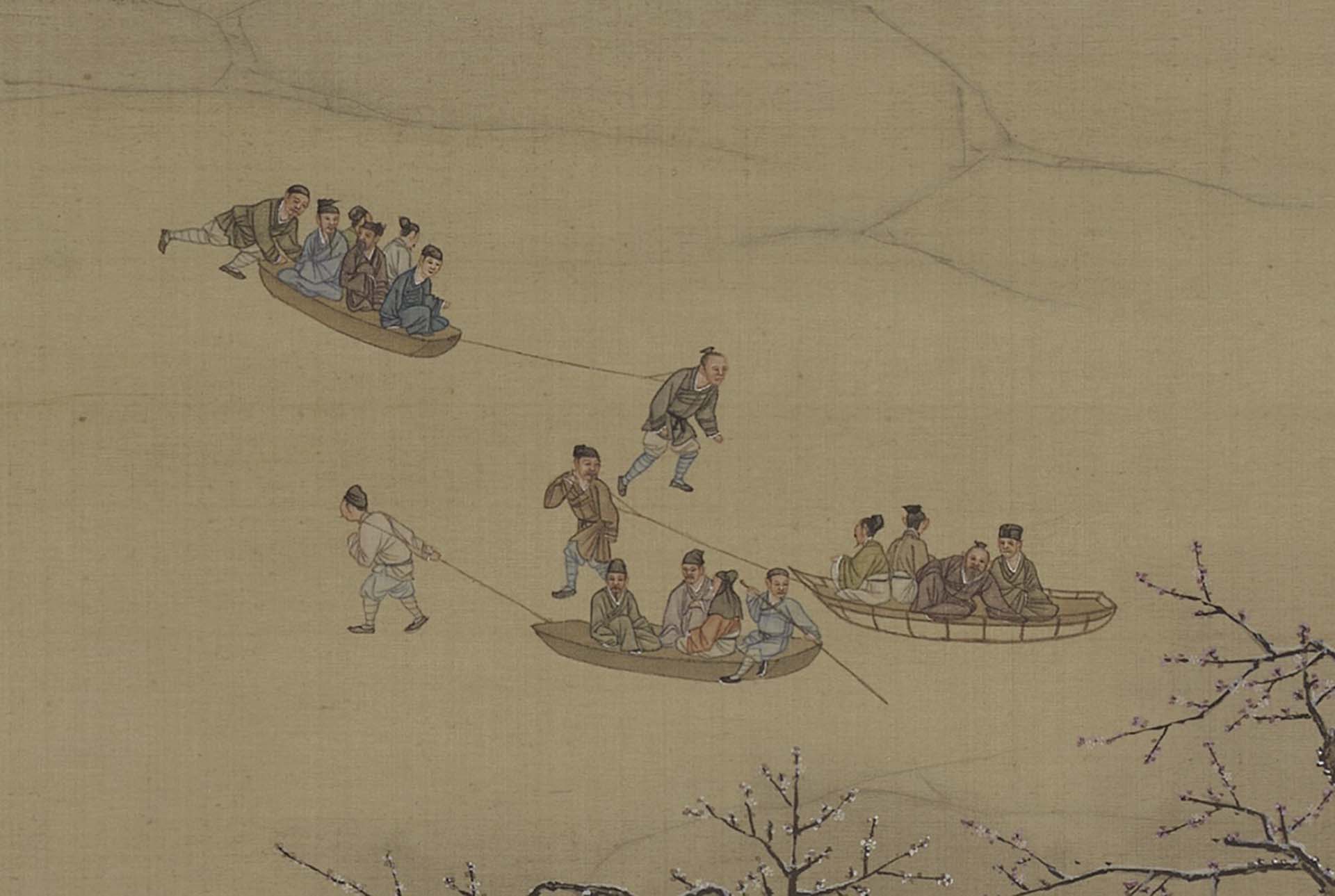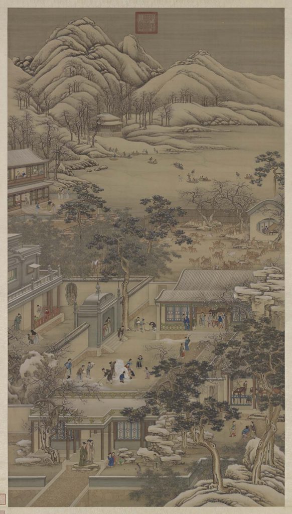 畫幅中隨著距離遠近,依比例縮放的物象,強化畫中活動人物存在於同一時空的感覺。如果說吳彬《歲華紀勝》的表現,讓種種人物與活動並置於同一個平面裡,那麼清〈畫院畫十二月月令圖〉就是將種種人物與活動嵌入同一個空間中。